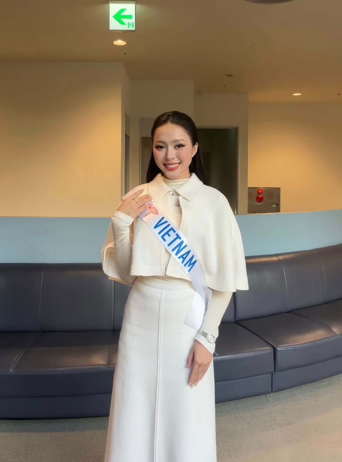 Tới Nhật Bản ngày đầu, nàng hậu diện một set đồ dạ ấm áp, mang phong cách của Miss International những năm trước đây. Miss International từng có thời gian luôn mặc áo choàng cho tân Hoa hậu.