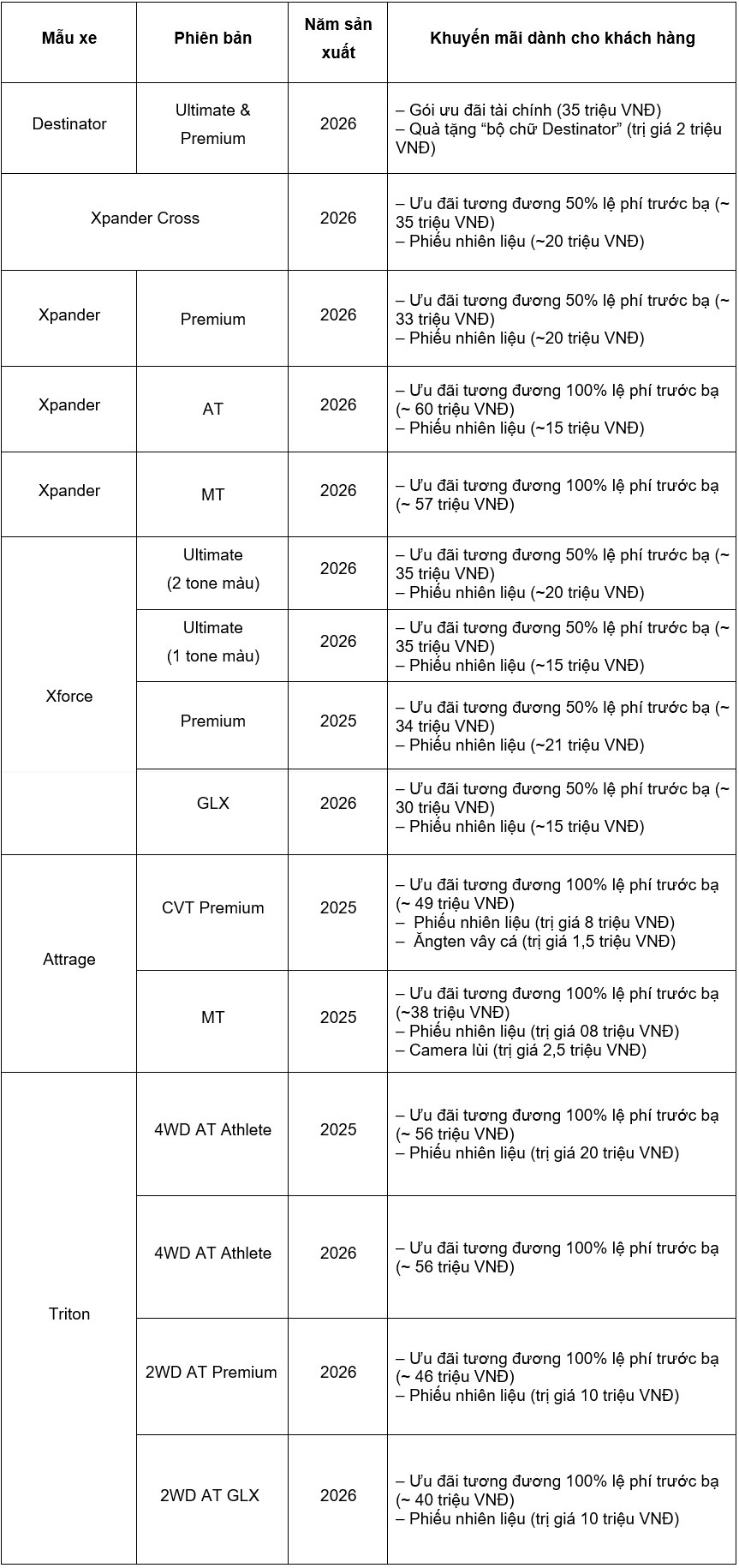Nhân dịp chào đón năm mới Bính Ngọ 2026, Mitsubishi Motors Việt Nam (MMV) chính thức triển khai chương trình ưu đãi đặc biệt cho tất cả các dòng xe chủ lực trong tháng 3, với một số mẫu xe được hỗ trợ tới 100% lệ phí trước bạ trong khi Xpander MT cũng được giới thiệu phiên bản mới năm 2026.