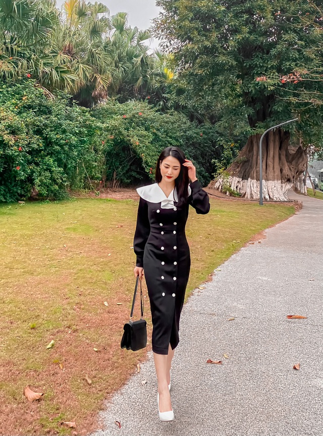 Cô diện đầm đen với thiết kế vừa nghiêm túc, vừa sang trọng.