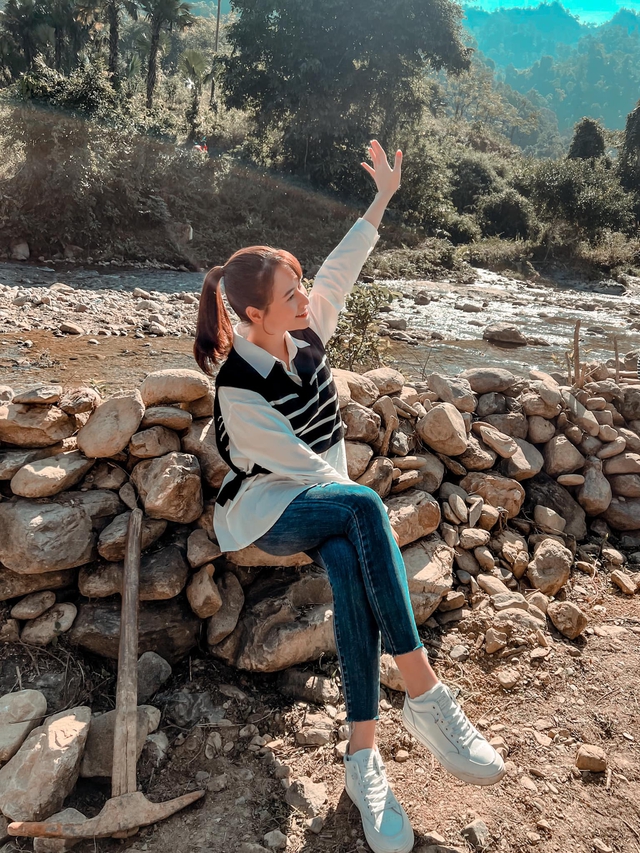 Trong hình ảnh khác, Việt Hoa năng động với áo sơ mi, quần jeans và cùng sneaker năng động.