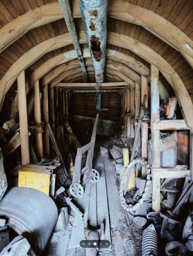 Ở bức ảnh tiếp theo, cánh cửa gỗ hiện ra rõ hơn, hé mở trong khung bê tông, hai bên là hai ô cửa sổ hình chữ nhật nhỏ, xung quanh cây cối mọc um tùm. Khi bước vào bên trong, người xem không khỏi bị cuốn hút bởi khung cảnh của một đường hầm cũ, được gia cố bằng những thanh dầm và cột gỗ chắc chắn. Sàn hầm phủ đầy bụi xám, một đường ống lớn gỉ sét chạy dọc trần nhà, xung quanh là các mảnh thiết bị bị bỏ hoang.
