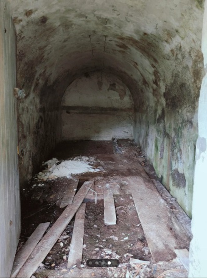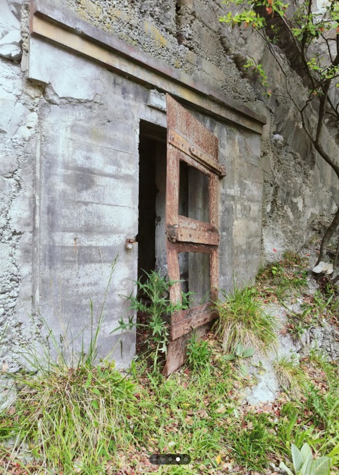 Một bức ảnh khác cho thấy phần còn lại của cánh cửa thứ hai, rỉ sét nặng và cũng đang hé mở. Trên khung bê tông vẫn còn dấu tích của một ổ khóa cũ, cho thấy nơi đây từng được bảo vệ nghiêm ngặt. Ở góc nhìn cuối cùng, đường hầm hiện ra với những bức tường cong màu trắng, nay đã chuyển sang xanh do nấm mốc và cỏ dại. Sàn chủ yếu là đất, xen lẫn vài tấm ván gỗ, dấu vết còn sót lại của một sàn gỗ trước kia. Cuối đường hầm dường như bị bịt kín bằng gạch.