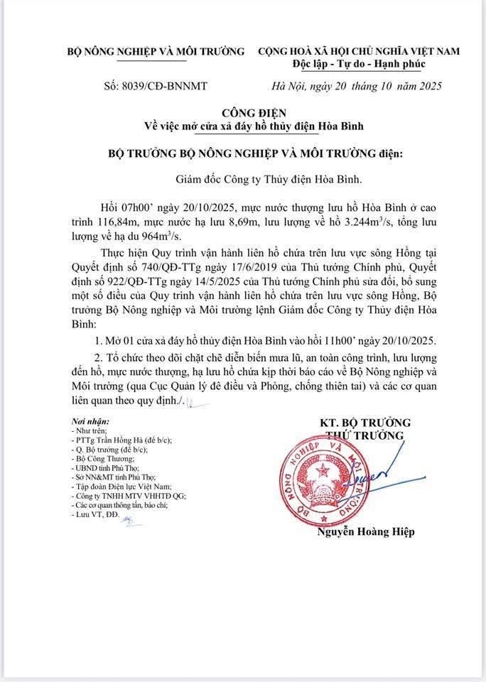 Mở 1 cửa xả đáy hồ thủy điện Hòa Bình từ 11h00 ngày 20/10/2025.