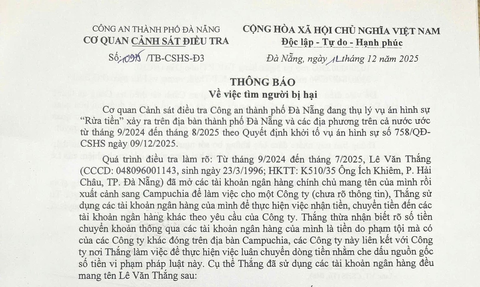 Để việc điều tra vụ án được triệt để, Công an TP Đà Nẵng thông báo tổ chức, cá nhân nào là bị hại liên quan đến giao dịch với các tài khoản của Lê Văn Thắng thì liên hệ Cơ quan Cảnh sát điều tra Công an TP Đà Nẵng (492 Lê Văn Hiến, phường Ngũ Hành Sơn, TP Đà Nẵng) hoặc Điều tra viên Dương Ngọc Tứ (số điện thoại: 0964941434) để được tiếp nhận giải quyết.