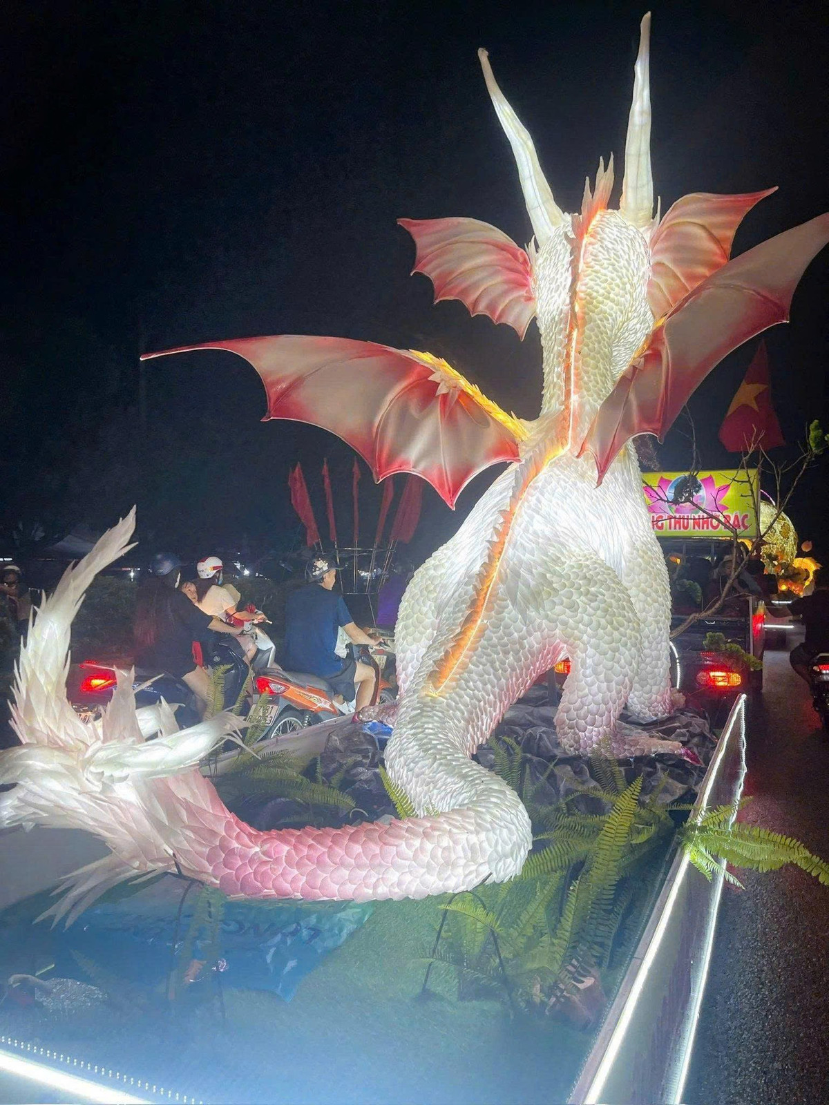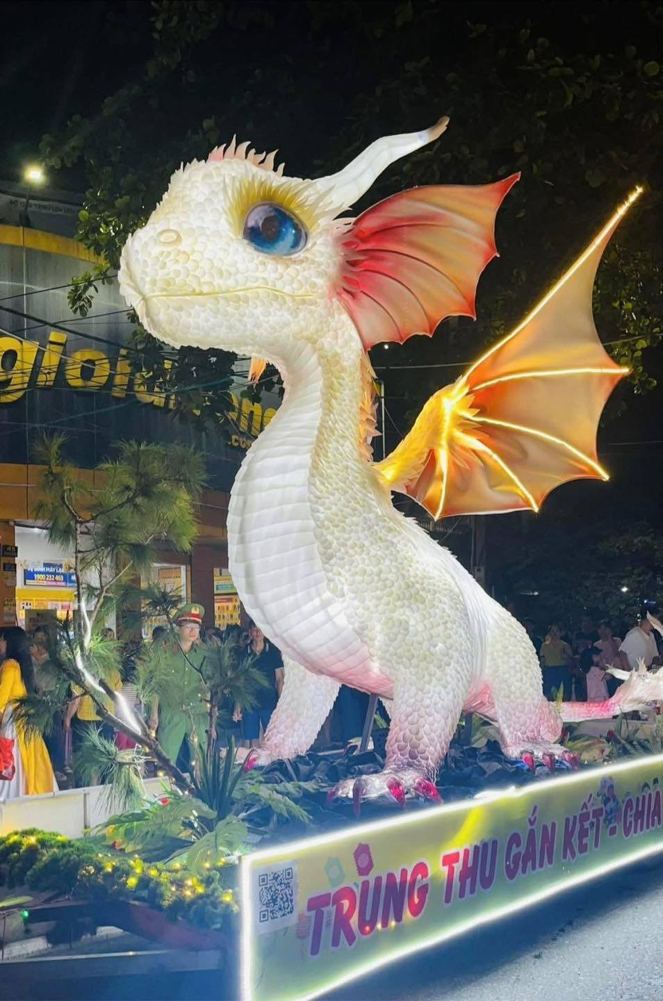 Chú Rồng được thiết kế với thân hình màu trắng bạch kim lấp lánh, mô phỏng lớp vảy tỉ mỉ. (Ảnh: Tổng hợp)