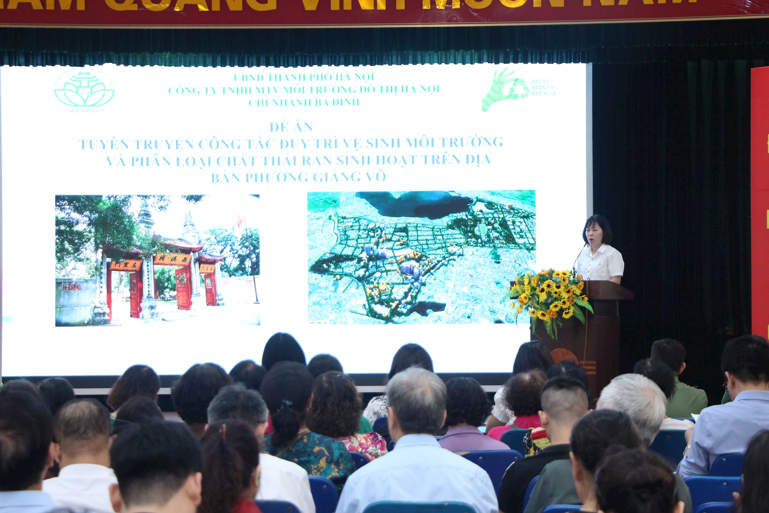 Đại diện Công ty TNHH MTV Môi trường Đô thị Hà Nội trình bày về đề án tuyên truyền duy trì vệ sinh môi trường và phân loại rác thải rắn sinh hoạt trên địa bàn phường Giảng Võ. Ảnh: TT