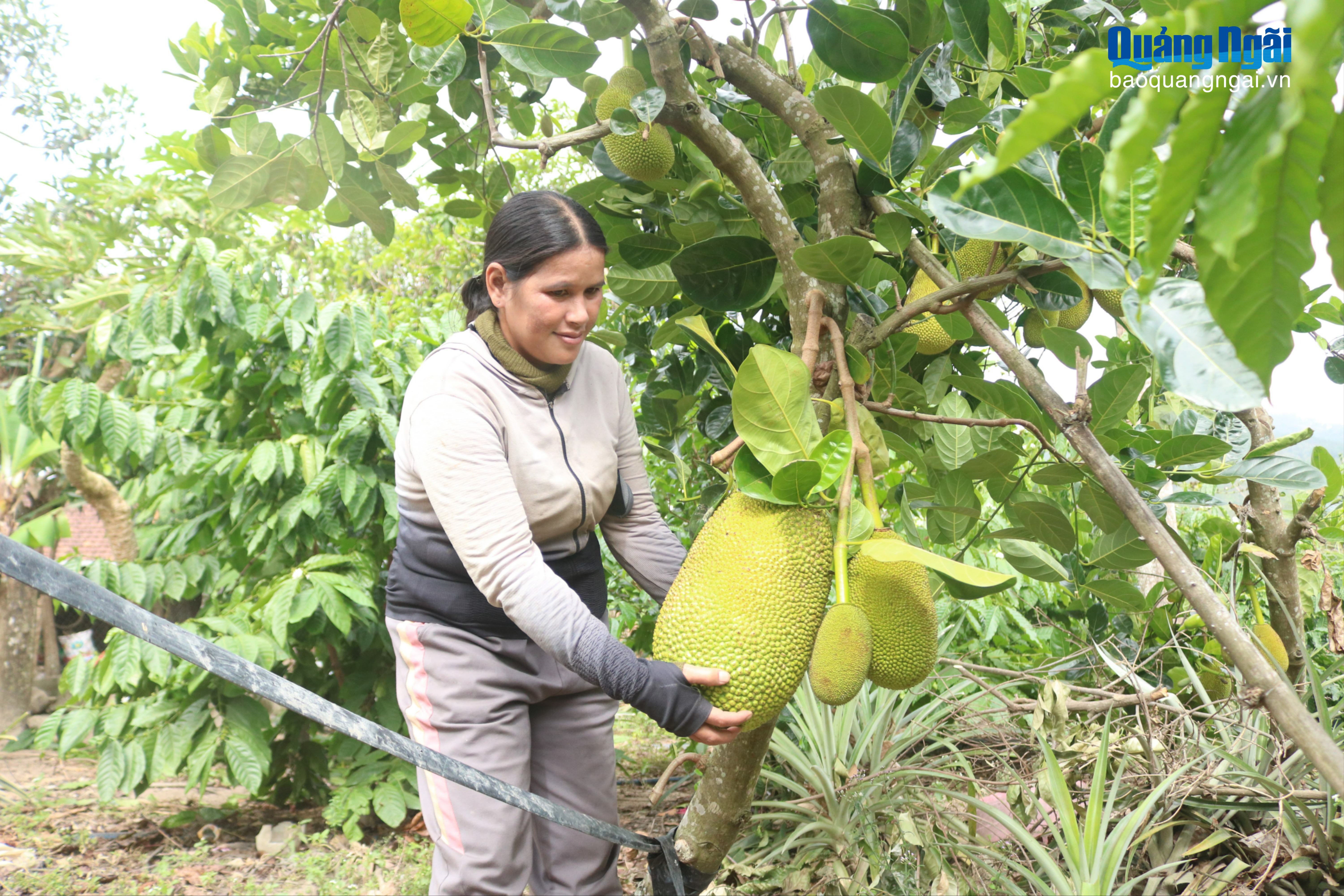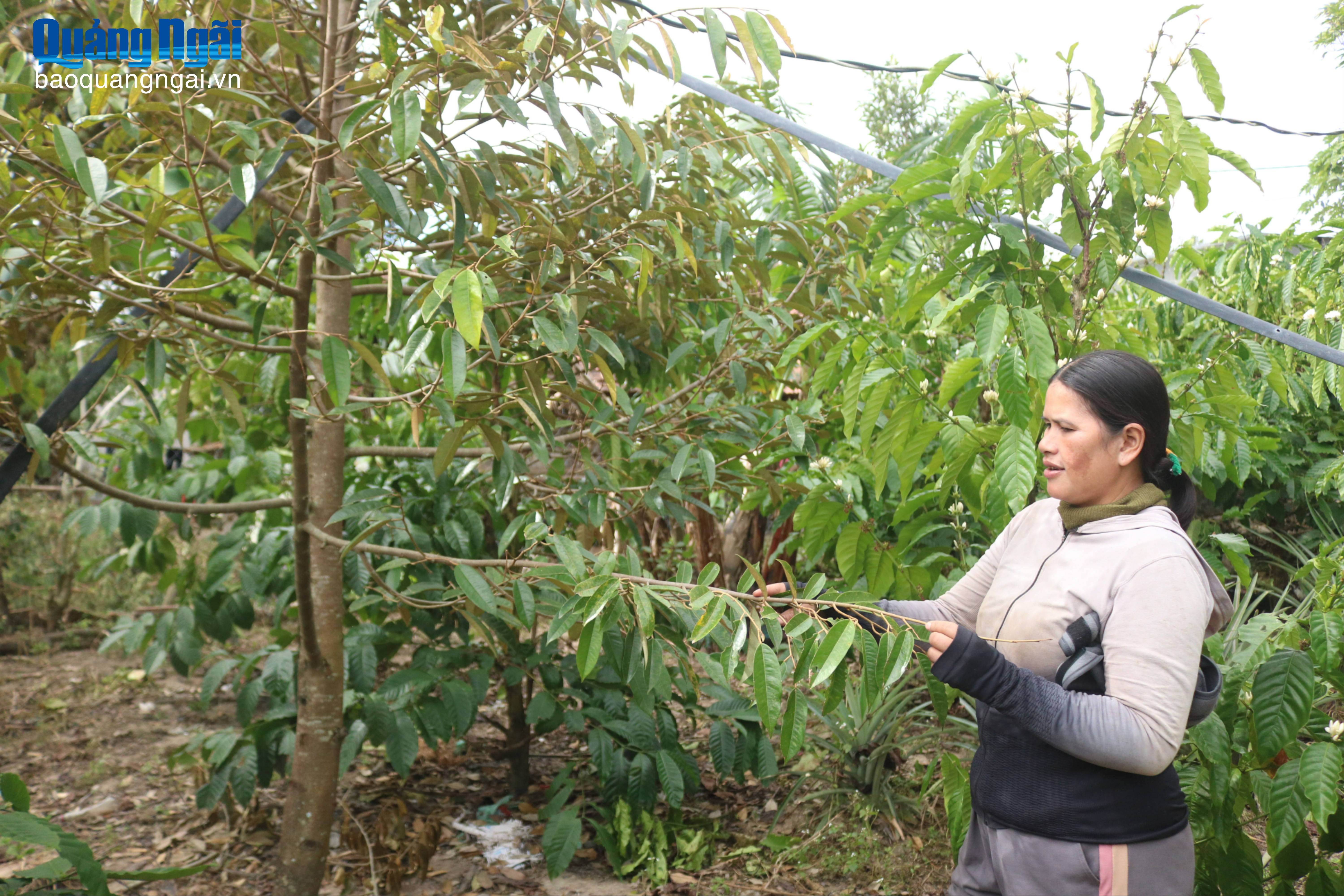 Năm 2023, gia đình được xã hỗ trợ giống cây sầu riêng và mít Thái từ nguồn vốn của Dự án 2. Tận dụng diện tích cà phê sẵn có, chị trồng xen vào các giống cây mà xã hỗ trợ.