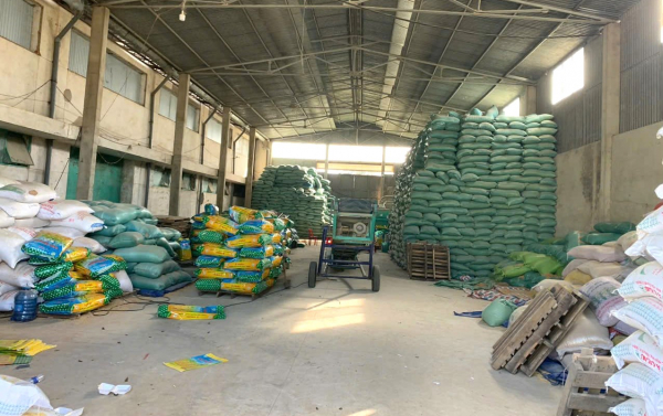 Hàng trăm bao lúa giống giả được phát hiện trong kho của Vũ.