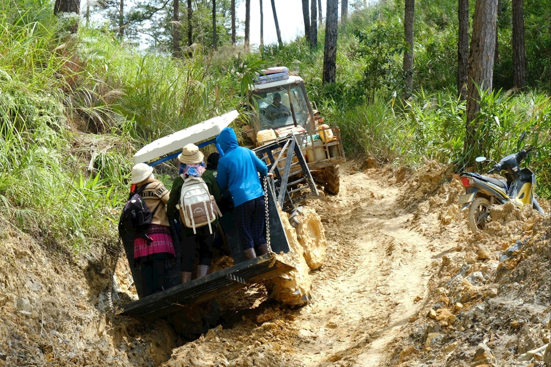 Ngoài đi bộ, máy cày gầm cao là phương tiện di chuyển duy nhất của bà con Tây Sơn mùa này