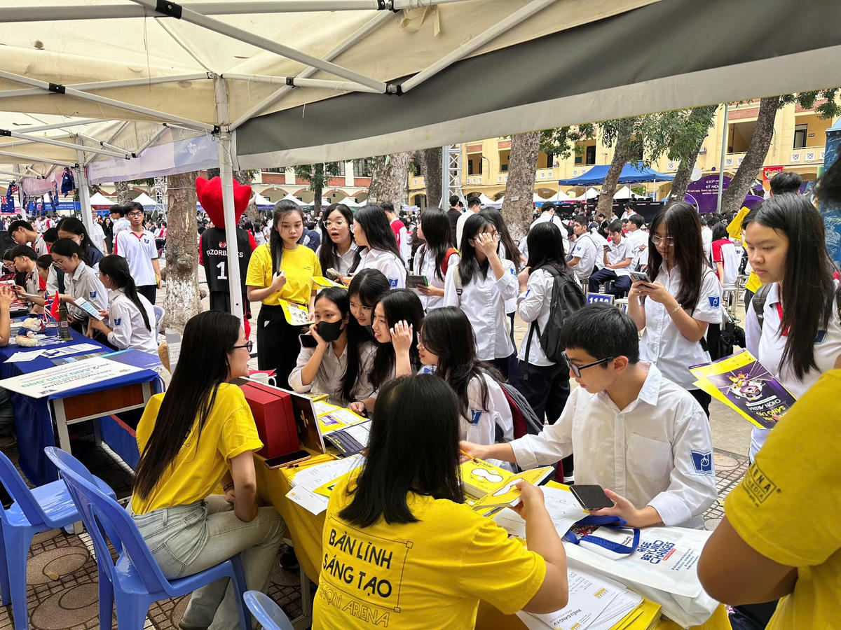 Học sinh Trường THPT Phan Đình Phùng (Hà Nội) tìm hiểu thông tin tuyển sinh. Ảnh: NTCCC.