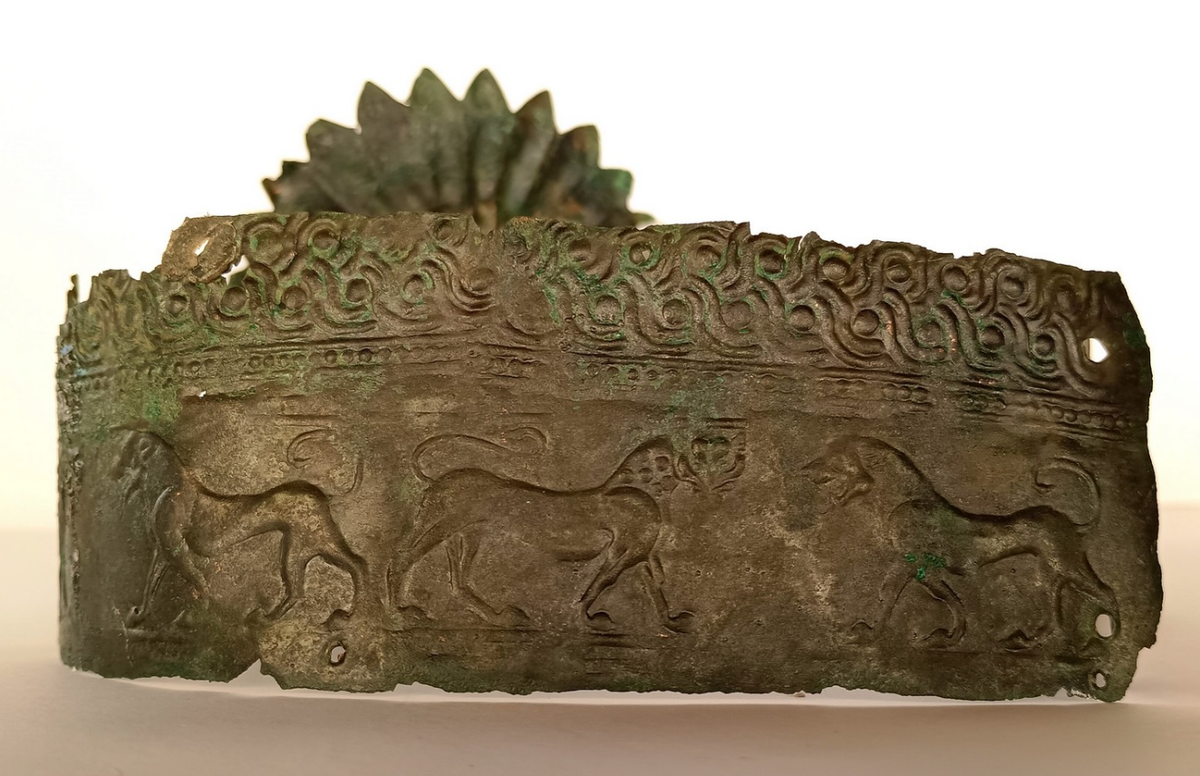 Dải đeo vương miện được chạm nổi hình cặp sư tử đực và cái đối diện nhau, biểu tượng cho quyền lực mạnh mẽ. Ảnh: @Hội đồng Khảo cổ Phthiotis và Evrytania.