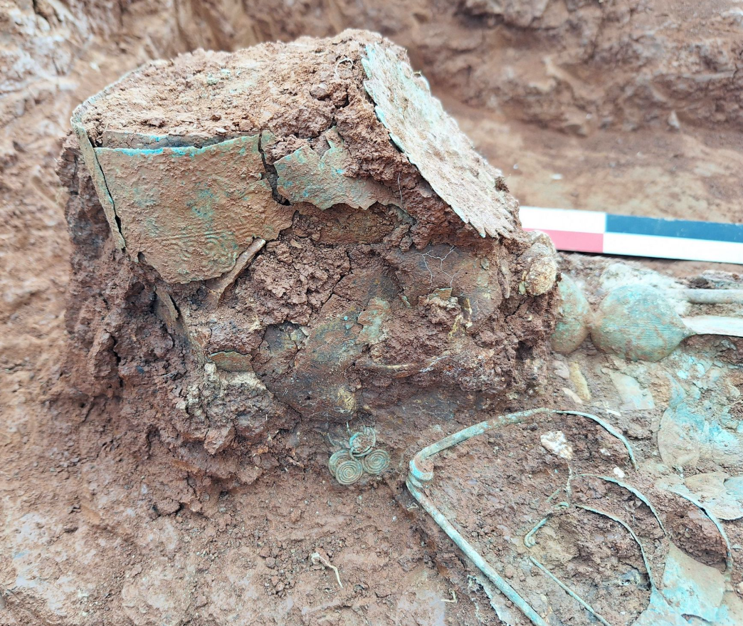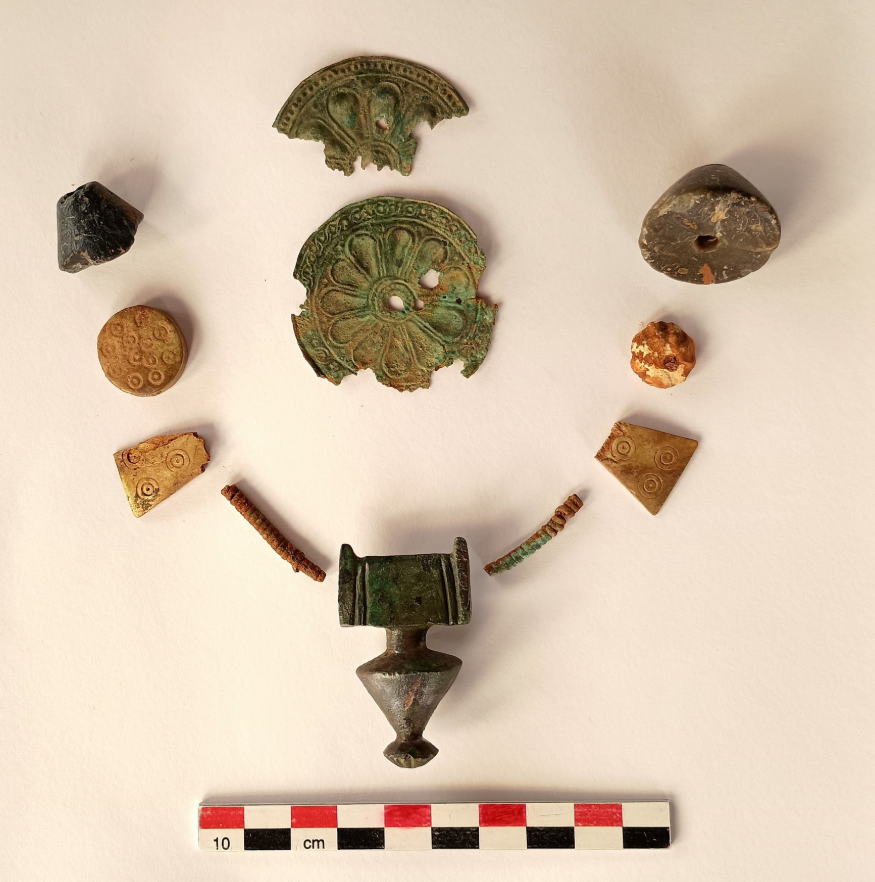 Ngoài ra, bà còn được chôn cất cùng vô số đồ vật quý giá khác, bao gồm hai chiếc trâm cài áo bằng đồng cỡ lớn theo phong cách Boeotian, được trang trí bằng những con ngựa hình học cách điệu, một chiếc vòng cổ, một chiếc bùa hộ mệnh hình bình hoa lớn ở giữa, hoa tai bằng đồng, một chiếc vòng tay và nhẫn xoắn ốc đeo trên tất cả các ngón tay. Ảnh: @Hội đồng Khảo cổ Phthiotis và Evrytania.