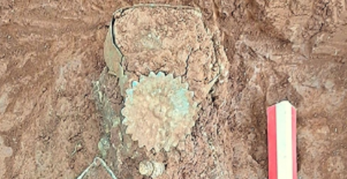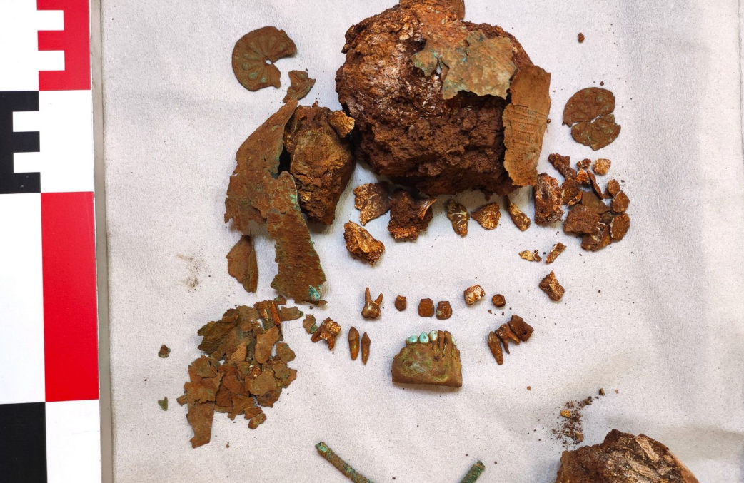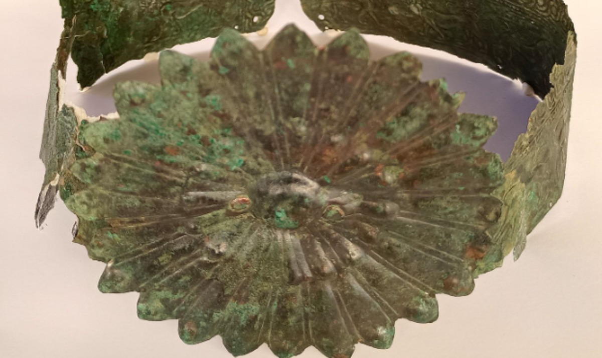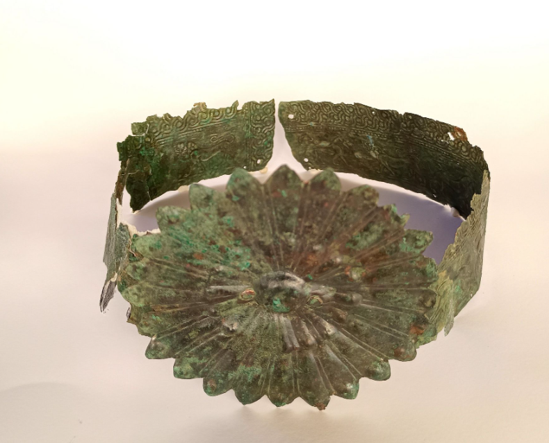 Bà được chôn cất với một vương miện bằng đồng có dải, trên đó có một hoa lớn hình mặt trời rực rỡ ở giữa trán. Ảnh: @Hội đồng Khảo cổ Phthiotis và Evrytania.