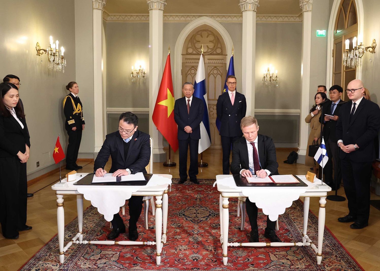 Tổng Bí thư Tô Lâm và Tổng thống Phần Lan Alexander Stubb chứng kiến lễ ký Biên bản ghi nhớ giữa Bộ Tài chính Việt Nam và Bộ Ngoại giao Phần Lan về việc hỗ trợ và thúc đẩy công tác chuẩn bị và triển khi các dự án được tài trợ theo Chương trình đầu tư công (PIF) của Phần Lan. (Ảnh: TTXVN)