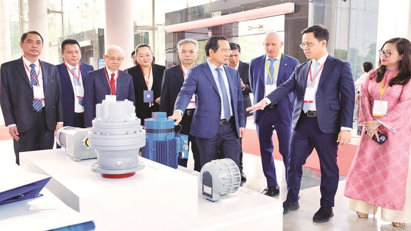 Lãnh đạo Thành phố Hồ Chí Minh và các đại biểu tham quan gian trưng bày sản phẩm động cơ điện của doanh nghiệp Italia đầu tư tại thành phố.