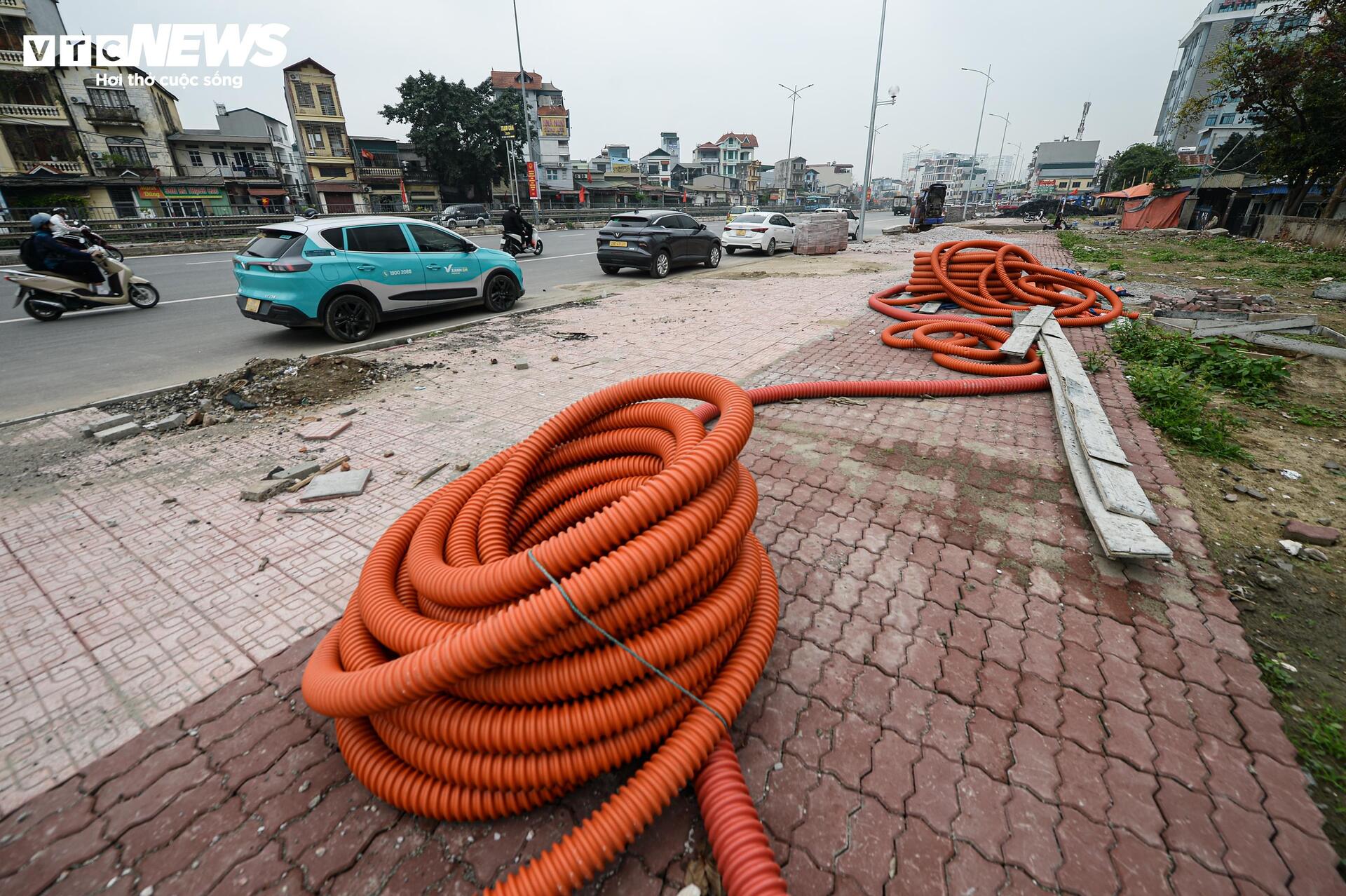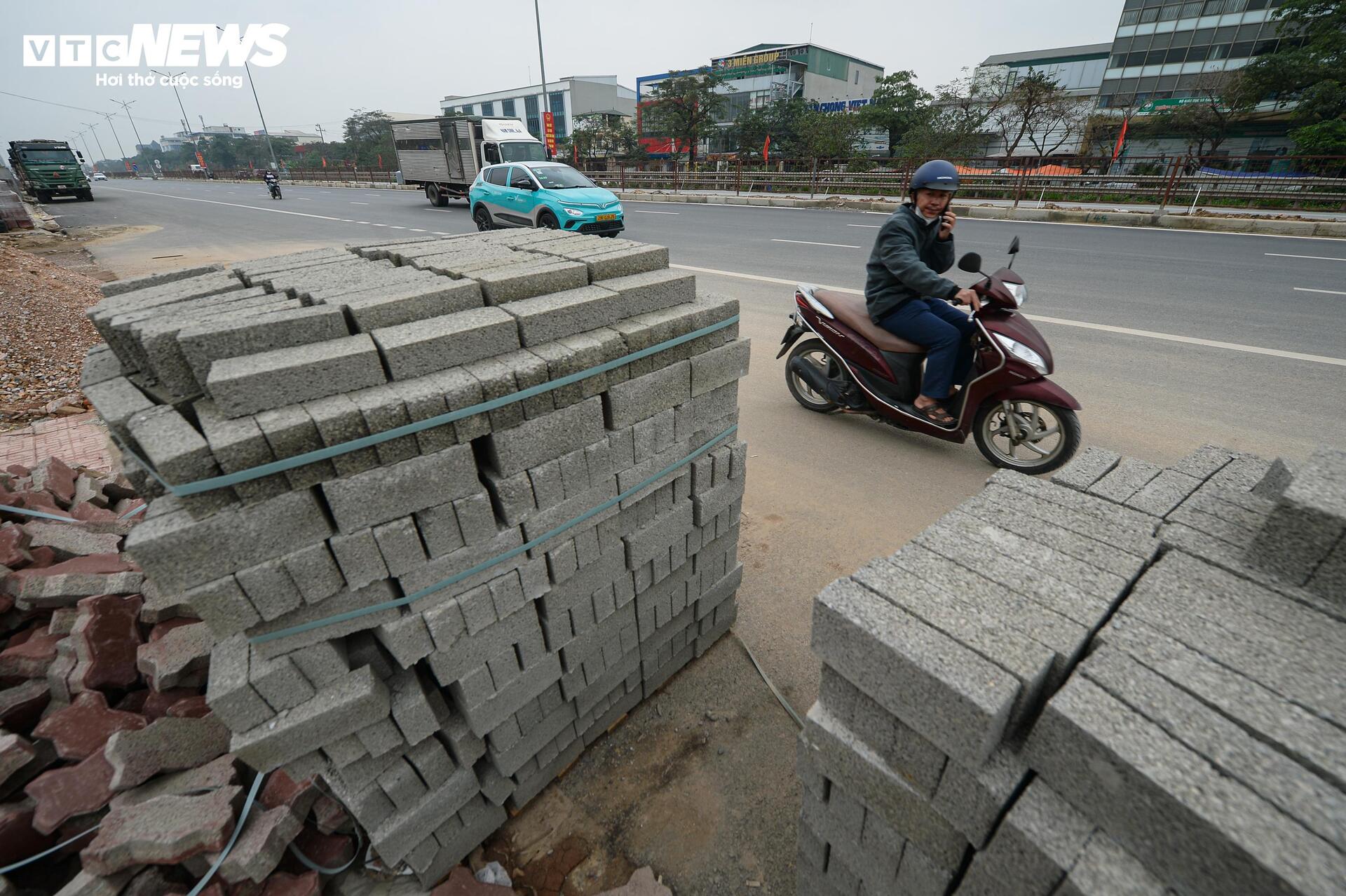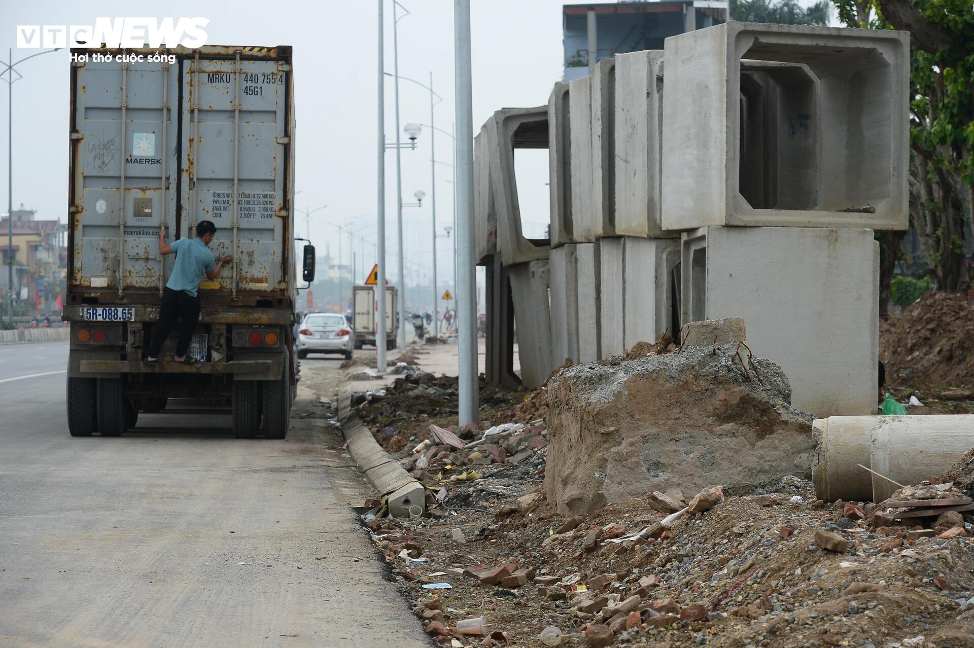 Tuy nhiên, dọc hai bên đường, nhiều đoạn vỉa hè vẫn chưa hoàn thiện, vật liệu xây dựng và các ống cống thoát nước vẫn tập kết ngay trên phần đất đang thi công