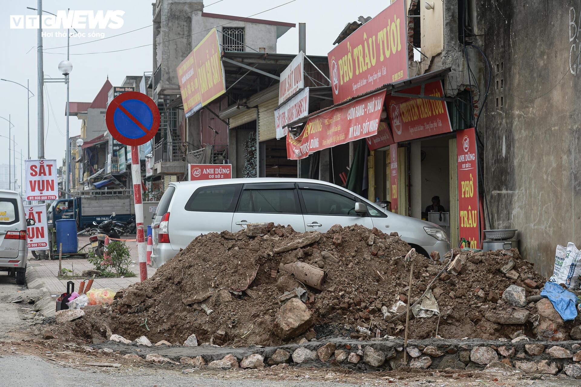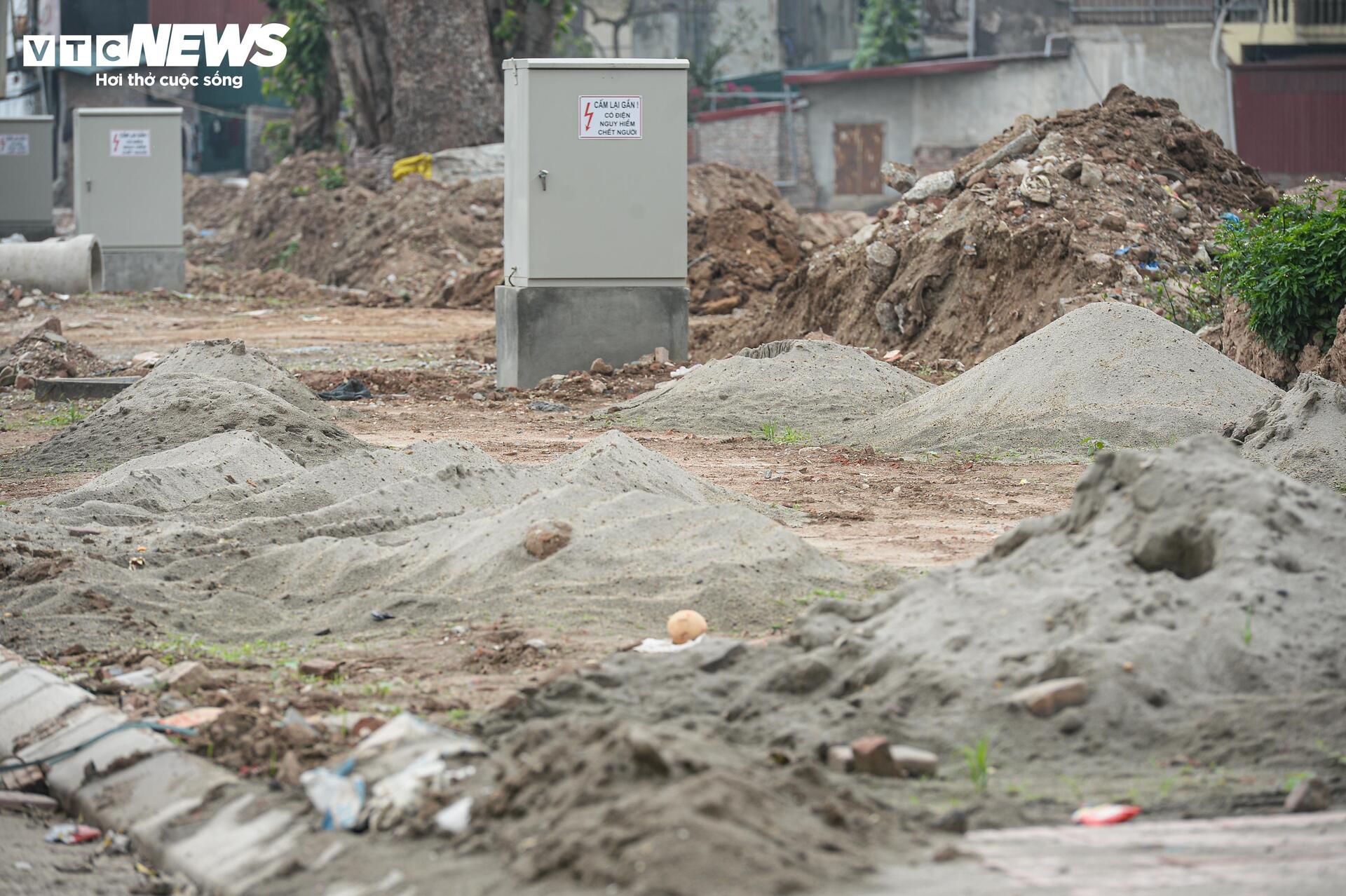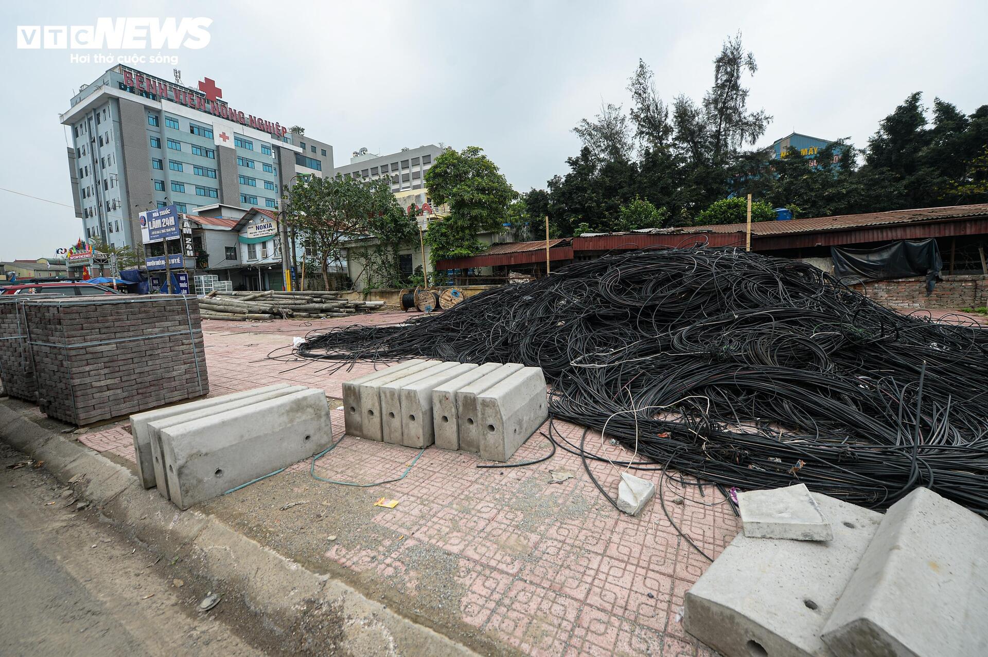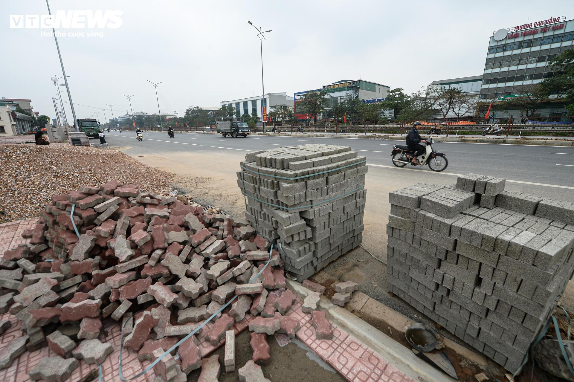Tuy nhiên, dọc hai bên đường, nhiều đoạn vỉa hè vẫn chưa hoàn thiện, vật liệu xây dựng và các ống cống thoát nước vẫn tập kết ngay trên phần đất đang thi công