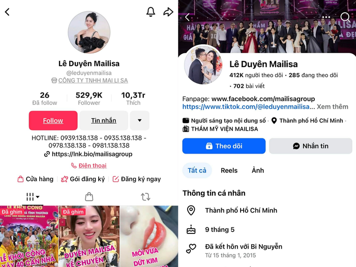 Trang TikTok và Facebook của con dâu bà chủ thẩm mỹ viện Mailisa. Ảnh chụp màn hình