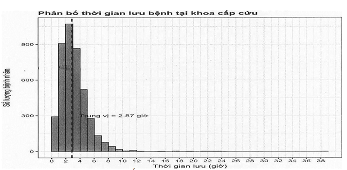 Nhóm nghiên cứu sử dụng mô hình hồi quy Gamma để đánh giá các yếu tố ảnh hưởng đến thời gian lưu. Kết quả cho thấy thời gian lưu trung vị của bệnh nhân tại khoa cấp cứu là 2,87 giờ, với khoảng tứ phân vị 1,85 – 4,07 giờ. Chỉ 7,2% bệnh nhân có thời gian lưu vượt quá 6 giờ – một tỷ lệ thấp so với mặt bằng chung của các bệnh viện tuyến cuối.