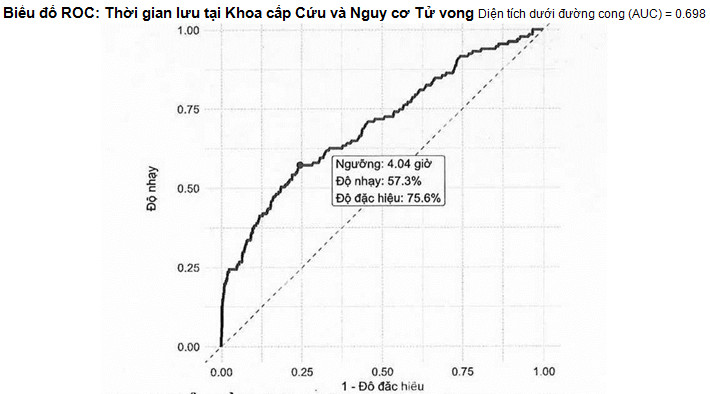 Các phân tích cho thấy mỗi giờ lưu thêm sau mốc 4 giờ làm tăng nguy cơ tử vong thêm 18,8%. Đường cong ROC xác định ngưỡng tối ưu là 4,04 giờ.
