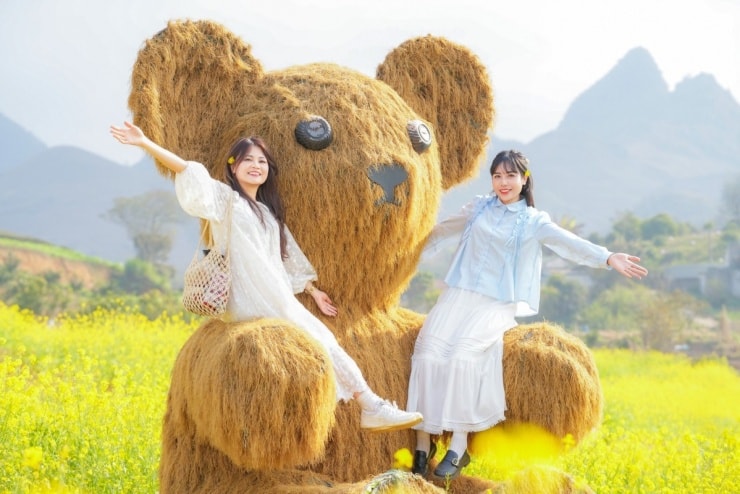 Tiểu cảnh gấu rơm cao gần 5 m được bố trí giữa cánh đồng để du khách check-in