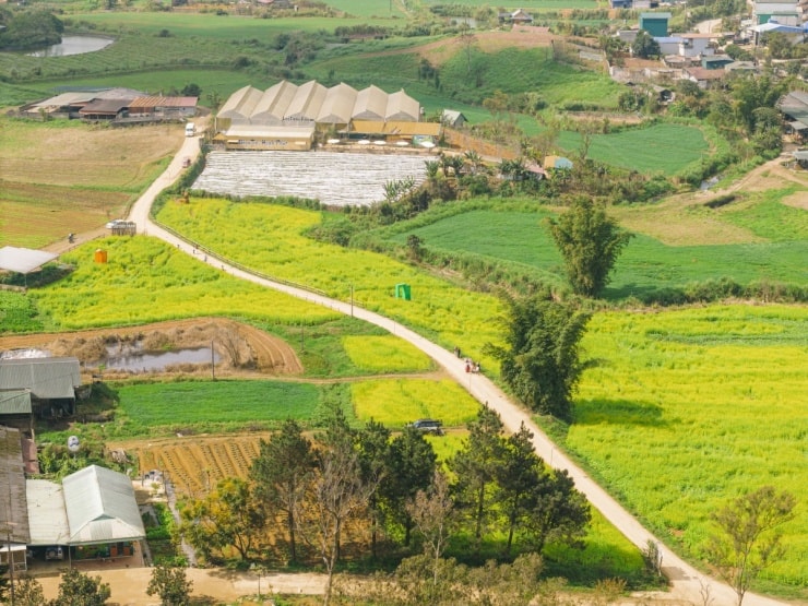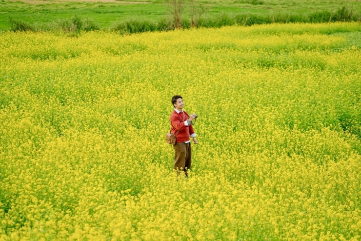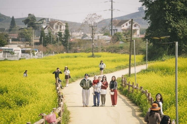 Bên cạnh hoa đào và hoa mận, mùa hoa cải tại Lõi Tươi Farm (phường Vân Sơn) đang là tâm điểm chú ý của giới xê dịch. Cách trung tâm thị trấn khoảng 8 km, nông trại này sở hữu đồi cải rộng hơn 10 ha. Đáng chú ý, đây là giống cải Nhật Bản với đặc điểm cánh to, màu vàng đậm và thân cao quá đầu gối, tạo nên khung cảnh rực rỡ hơn so với các giống cải thông thường.