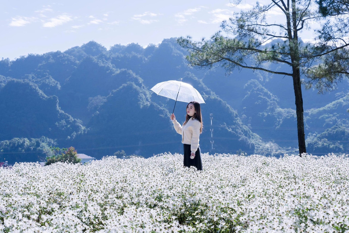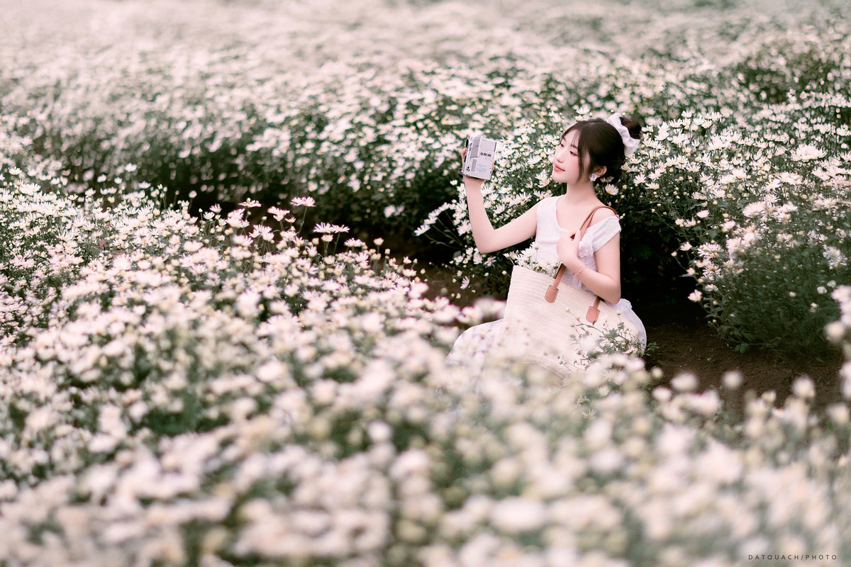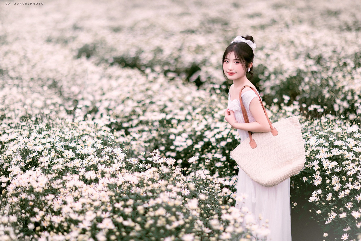 Trang phục để chụp ảnh với cúc họa mi cũng được gợi ý theo hướng nhẹ nhàng và tinh tế. Một chiếc váy pastel – hồng phớt, xanh nhạt hay tím lilac – luôn giúp du khách hòa vào vẻ mềm mại của hoa. Áo dài trắng mang đến nét thanh lịch, cổ điển và rất hợp với phông nền trắng muốt. Ảnh Dat Quach