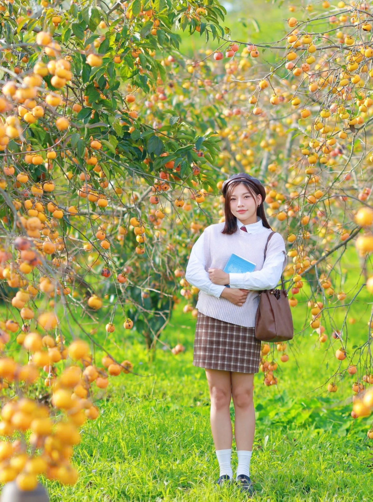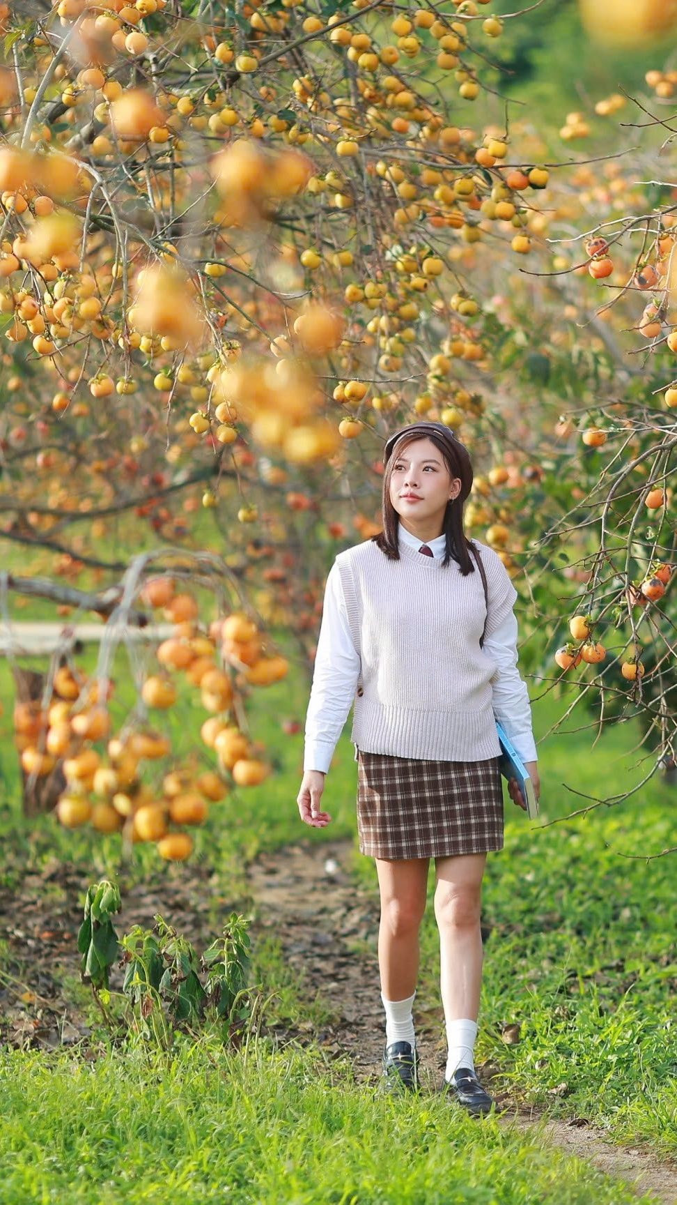 Để có những bức ảnh ưng ý, du khách nên đến vườn vào sáng sớm hoặc chiều muộn, khi ánh nắng vàng nhẹ chiếu qua từng cành hồng chín. Những gam màu tự nhiên như trắng, be, nâu đất hoặc đỏ gạch sẽ giúp tôn lên sắc cam nổi bật của quả. Ảnh Nguyễn Hồng Anh