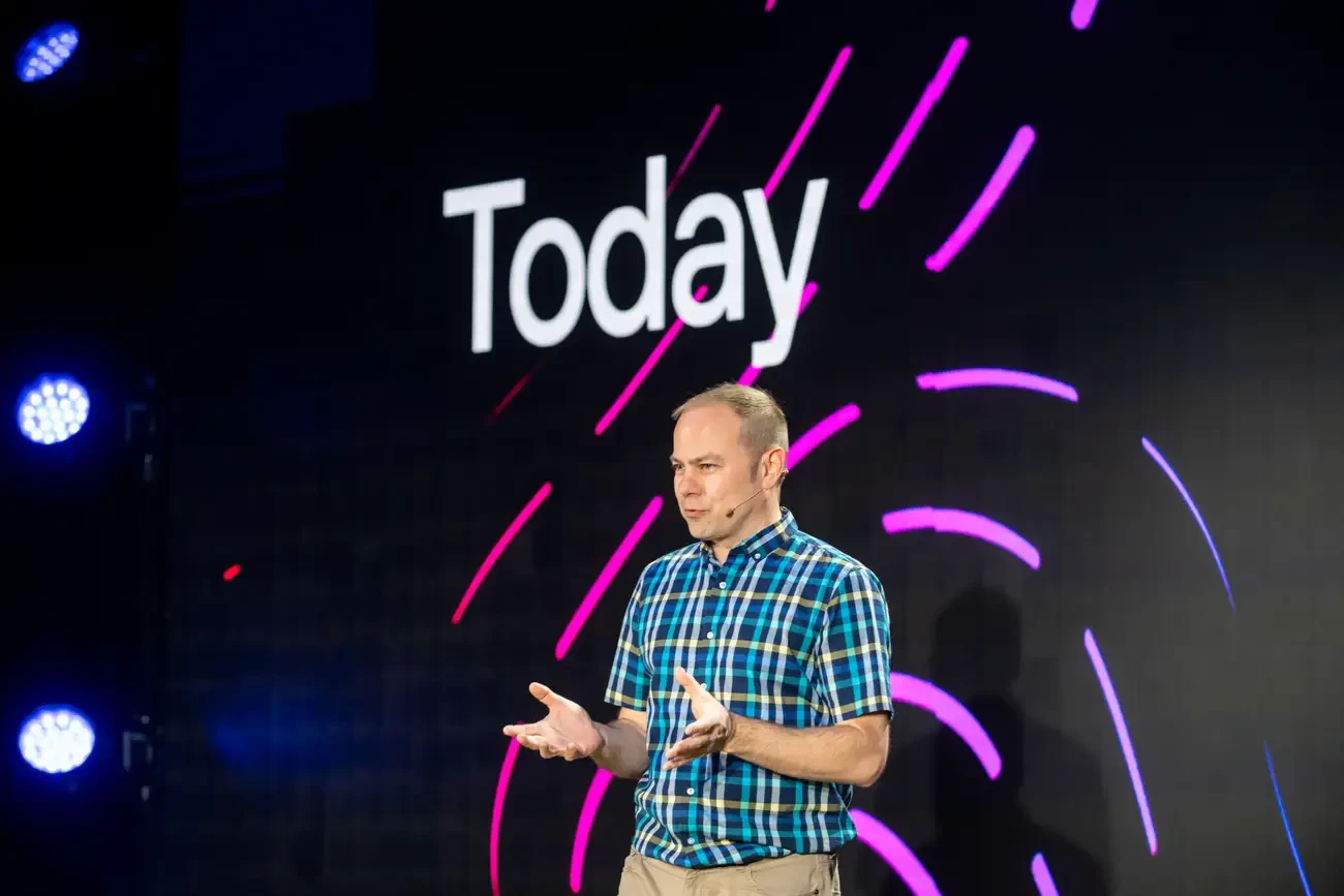 Chris Lattner đứng trên sân khấu cùng Tim Davis (phải), đồng sáng lập kiêm Chủ tịch Modular - Ảnh: Chloe Jackman