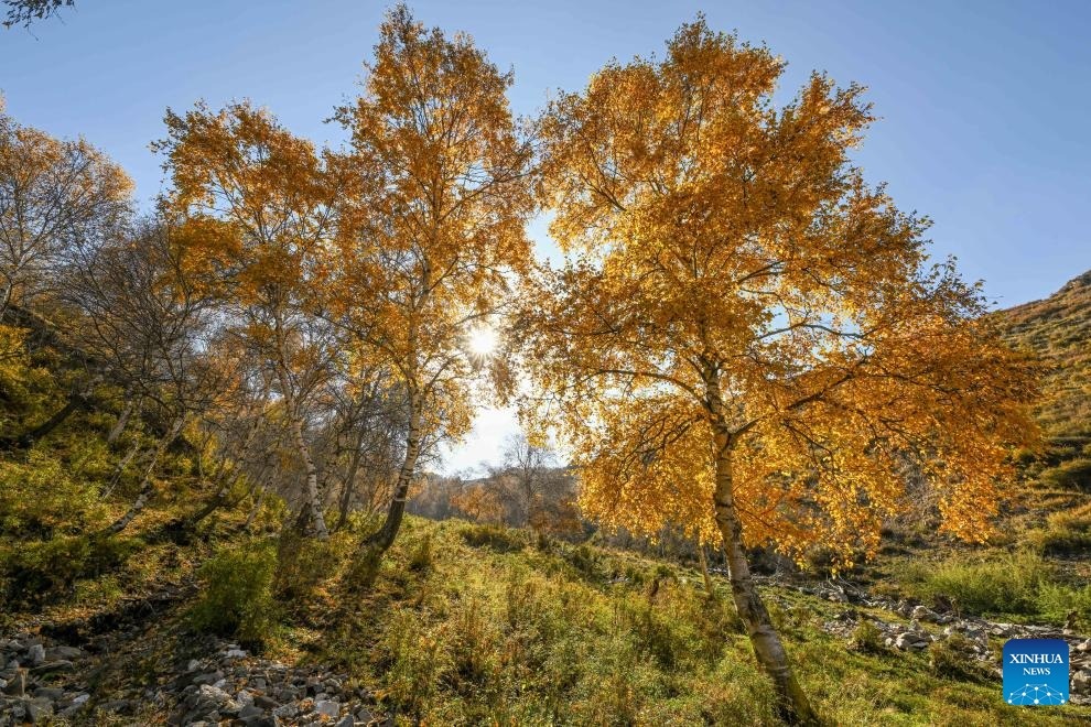 Tại Khu bảo tồn thiên nhiên Daqingshan (khu tự trị Nội Mông, Trung Quốc), mùa lá vàng bắt đầu từ đầu tháng 10. Thời điểm này, những rừng bạch quả và cây dương đồng loạt chuyển màu vàng, đỏ, cam rực rỡ. Dưới ánh nắng ban mai, cả khu rừng khoác lên vẻ đẹp nên thơ, mê hoặc du khách. Ảnh: Xinhua.