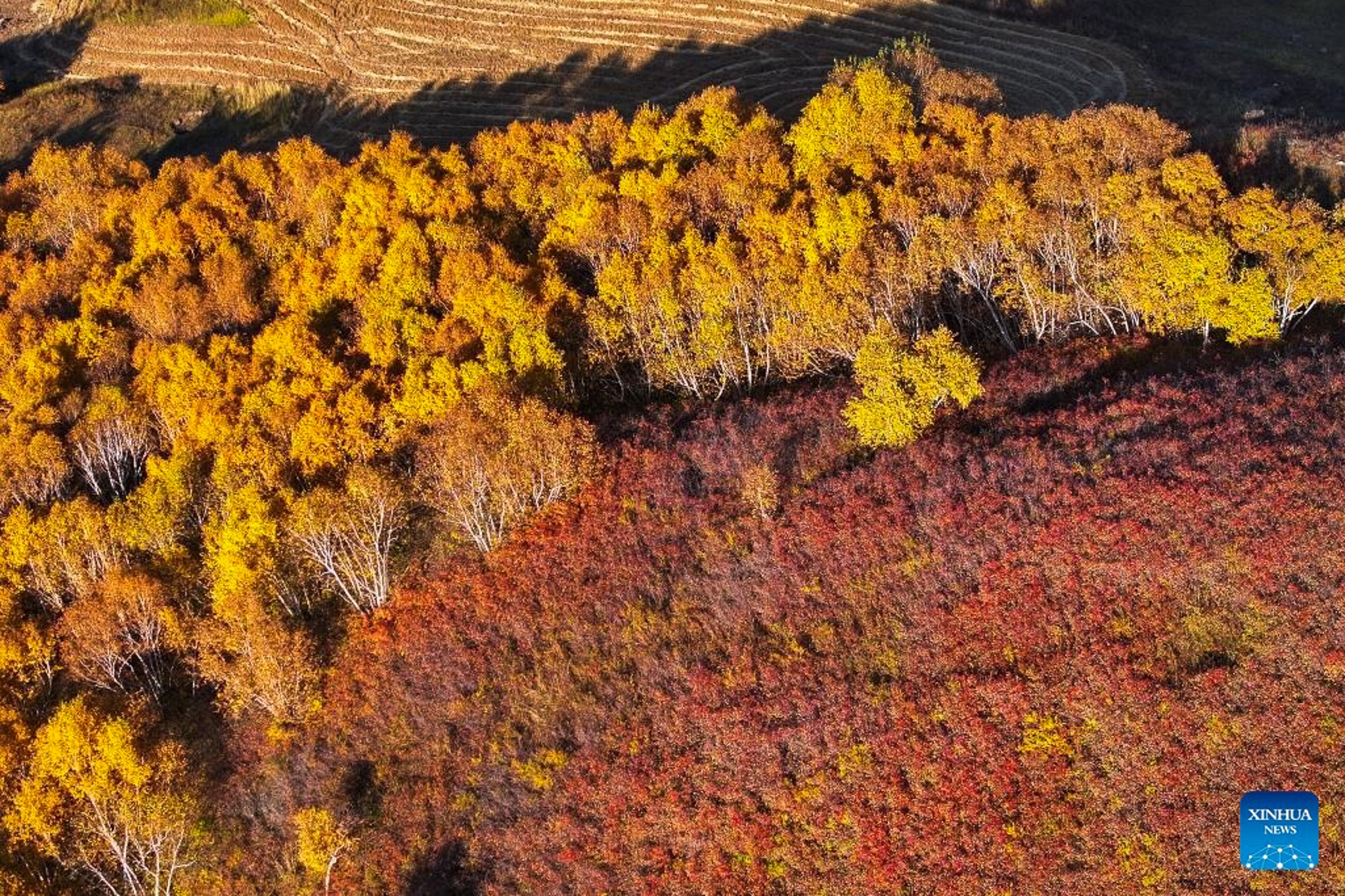 Đầu tháng 10, nhiều điểm đến ở Trung Quốc khoác lên mình chiếc áo mùa thu rực rỡ với sắc vàng, sắc đỏ. Tại Công viên quốc gia Arxan (khu tự trị Nội Mông), những hàng bạch quả chuyển vàng óng ánh, tạo nên khung cảnh siêu thực khi nhìn từ trên cao. Ảnh: Xinhua.