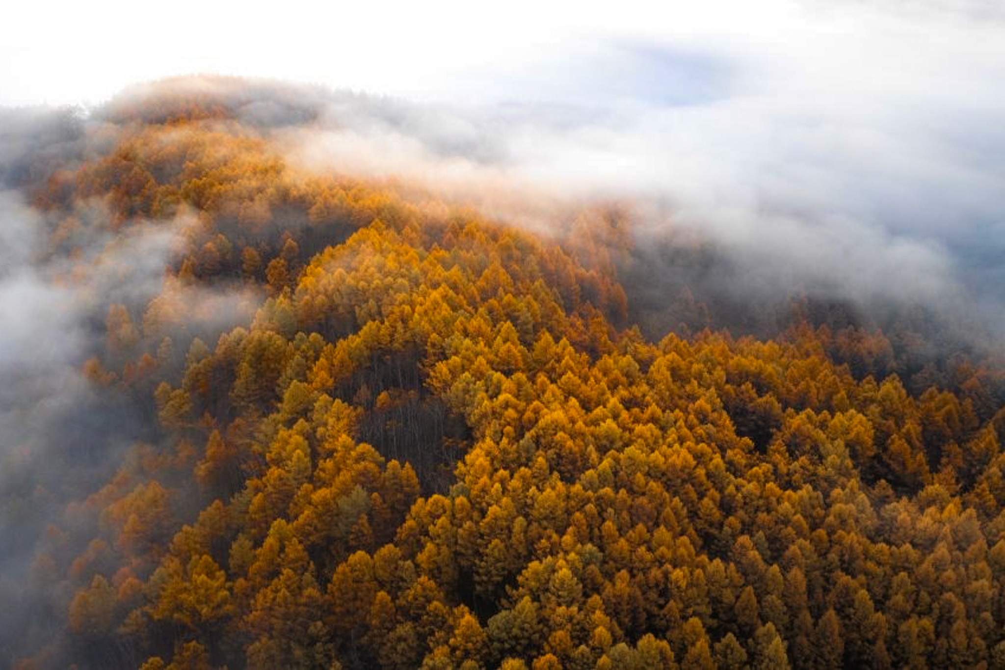 Dưới màn sương mỏng, khu rừng mùa thu hiện ra với vẻ đẹp vừa ma mị vừa huyền ảo. Từ trên cao nhìn xuống, khung cảnh như một bức tranh thủy mặc. Ảnh: Xinhua.