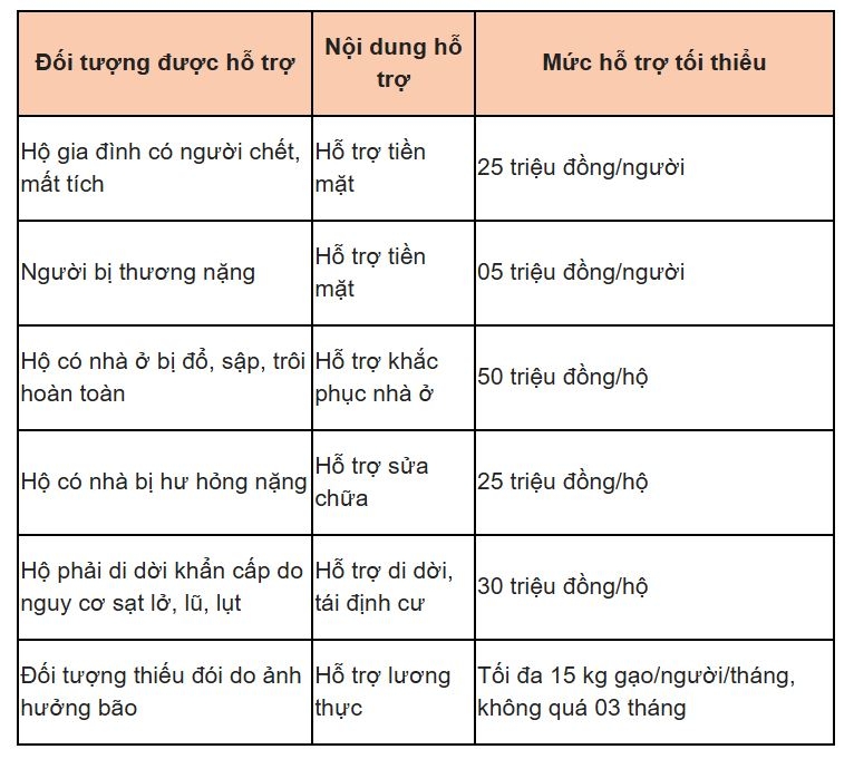 Theo Hướng dẫn 16/HD-MTTW-BVĐTW, các hộ gia đình, cá nhân bị ảnh hưởng bởi bão số 10 sẽ được hỗ trợ tùy theo mức độ thiệt hại như sau: