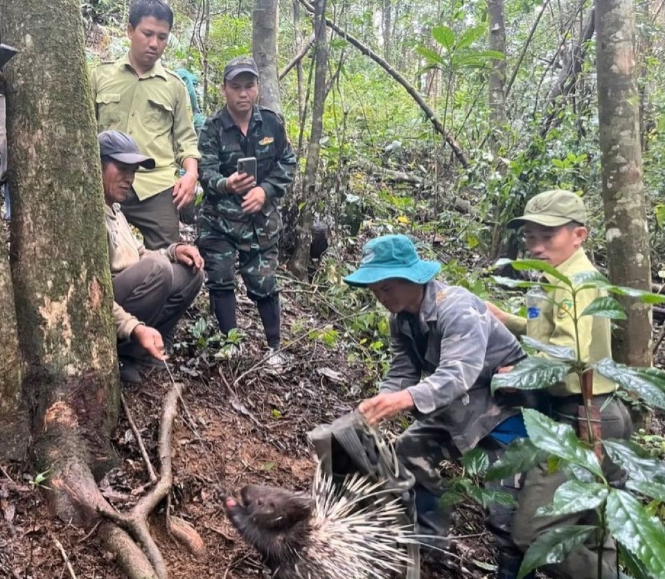 Lực lượng bảo vệ rừng phát hiện, giải cứu một con nhím khỏi bẫy thú. Ảnh: T.L