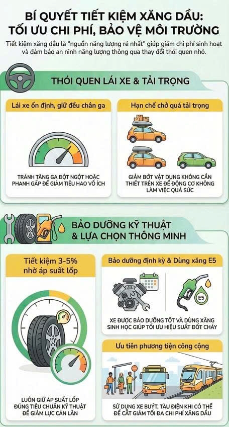 Trong bối cảnh thị trường năng lượng thế giới còn nhiều yếu tố khó lường, tiết kiệm nhiên liệu đang được xem là giải pháp thiết thực nhất. Chỉ cần thay đổi một vài thói quen nhỏ như giữ tốc độ ổn định, hạn chế tăng ga đột ngột, kiểm tra áp suất lốp hay bảo dưỡng phương tiện định kỳ cũng có thể giảm đáng kể lượng xăng tiêu thụ.