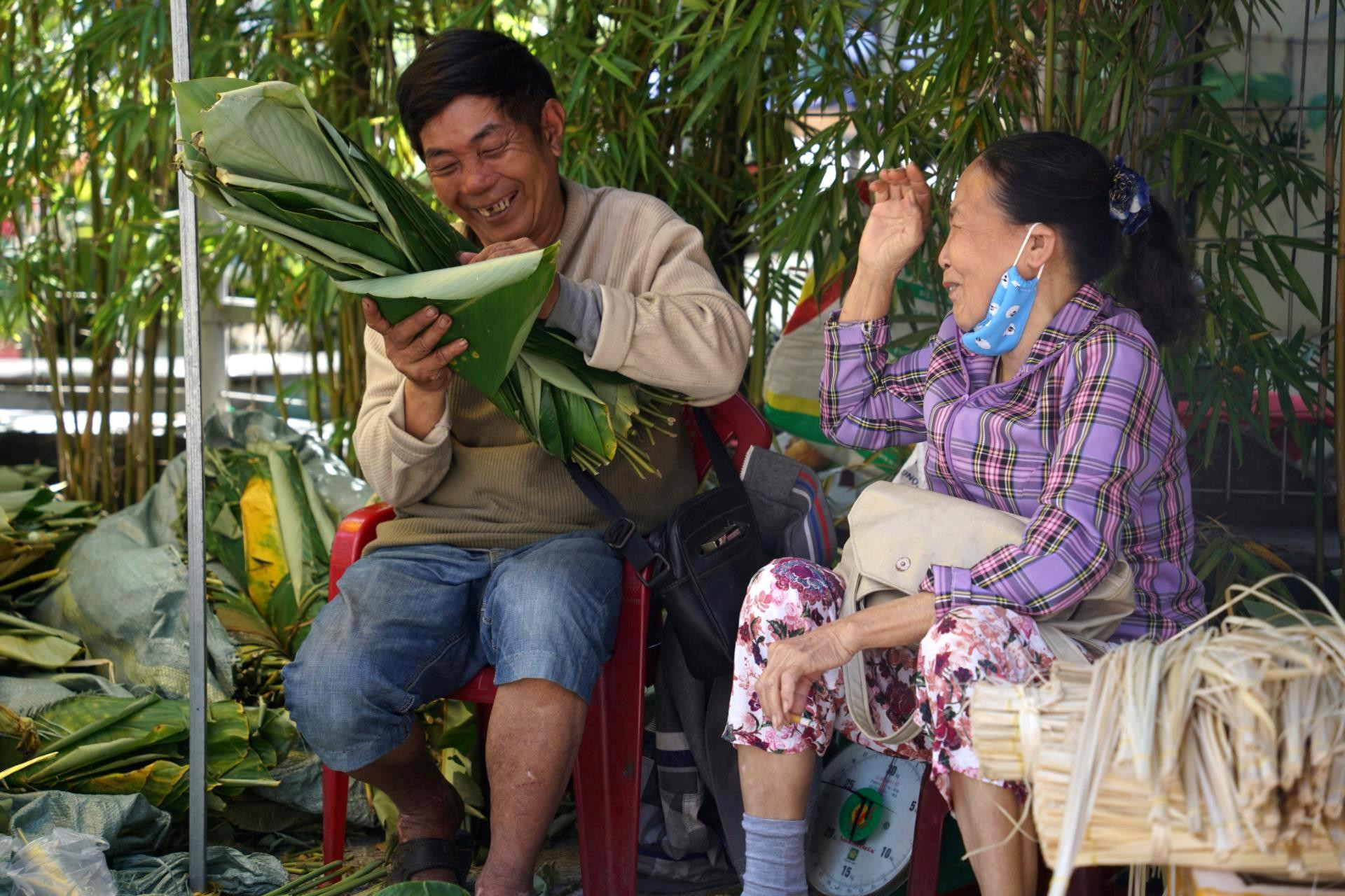 “Năm nào cũng nghe bà nói đau chân, mà năm nào cũng thấy có mặt ở đây bán”, người phụ nữ vừa báo đơn hàng vừa cười đùa với bà Nguyễn Thị Hai (70 tuổi, phường Hòa Khánh). Năm nào vợ chồng người phụ nữ này cũng ghé lấy lá số lượng lớn để gói bánh chưng bán dịp Tết.