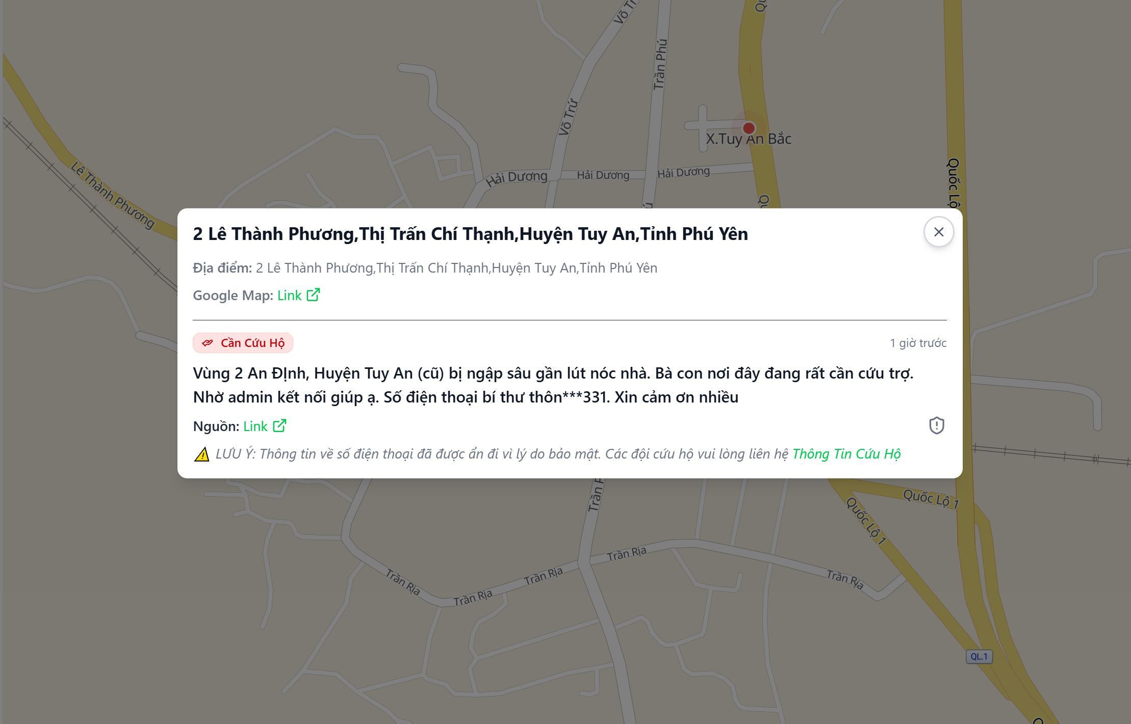 Thông tin được phản ánh trực quan trên bản đồ, số điện thoại được bảo mật và được cung cấp khi liên hệ với nhóm trực tiếp. (Ảnh: Chụp màn hình)