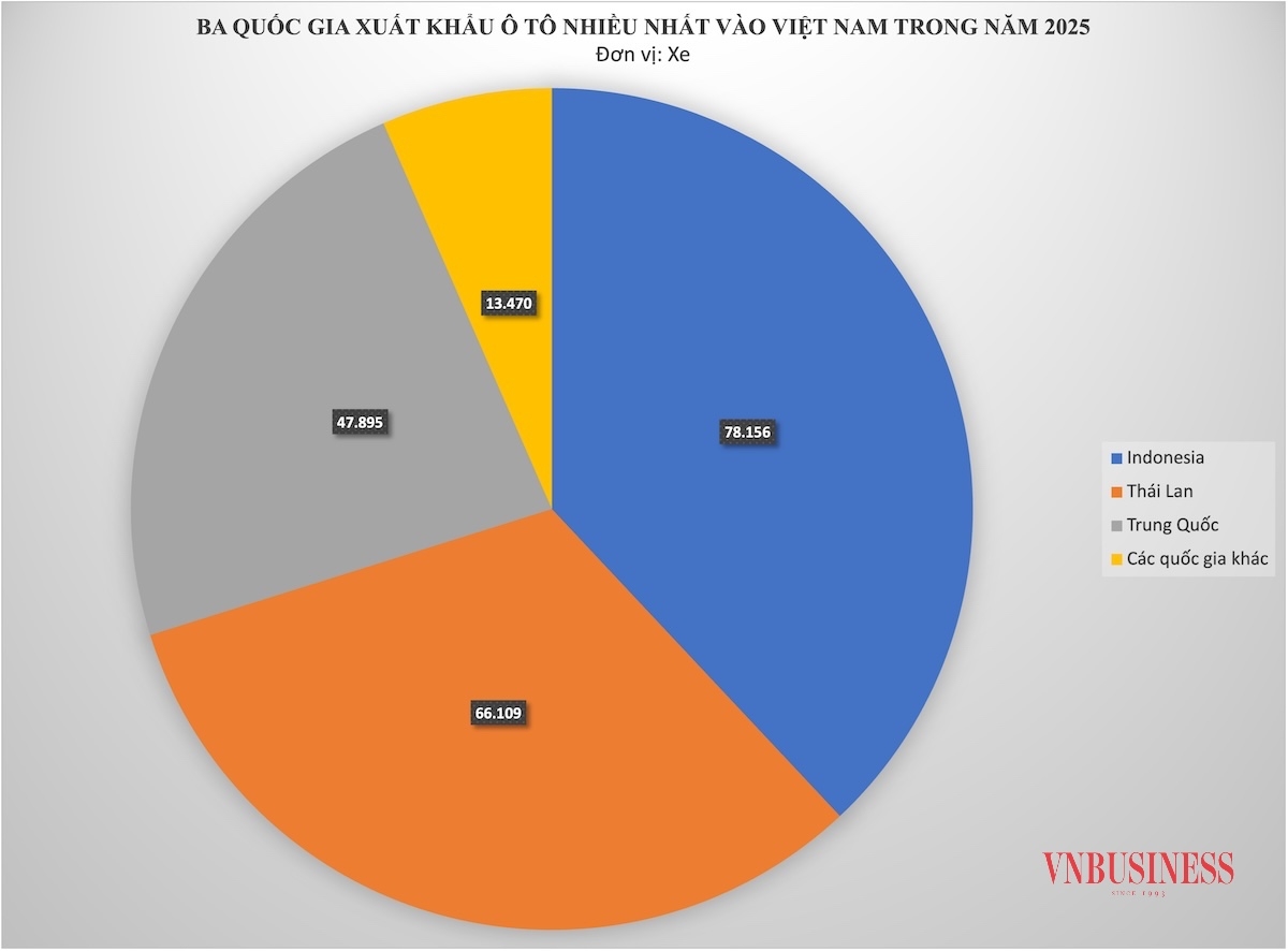 Đáng chú ý, thị trường xe nhập khẩu năm 2025 tiếp tục là sân chơi của ba "ông lớn": Indonesia, Thái Lan và Trung Quốc. Cụ thể, Indonesia dẫn đầu về số lượng với 78.156 xe (kim ngạch 1,1 tỷ USD). Tiếp đến là Thái Lan với 66.109 xe, nhưng đạt giá trị kim ngạch cao hơn, khoảng 1,3 tỷ USD. Hai quốc gia Đông Nam Á này vẫn giữ vững vị thế nhờ lợi thế thuế quan trong khu vực.