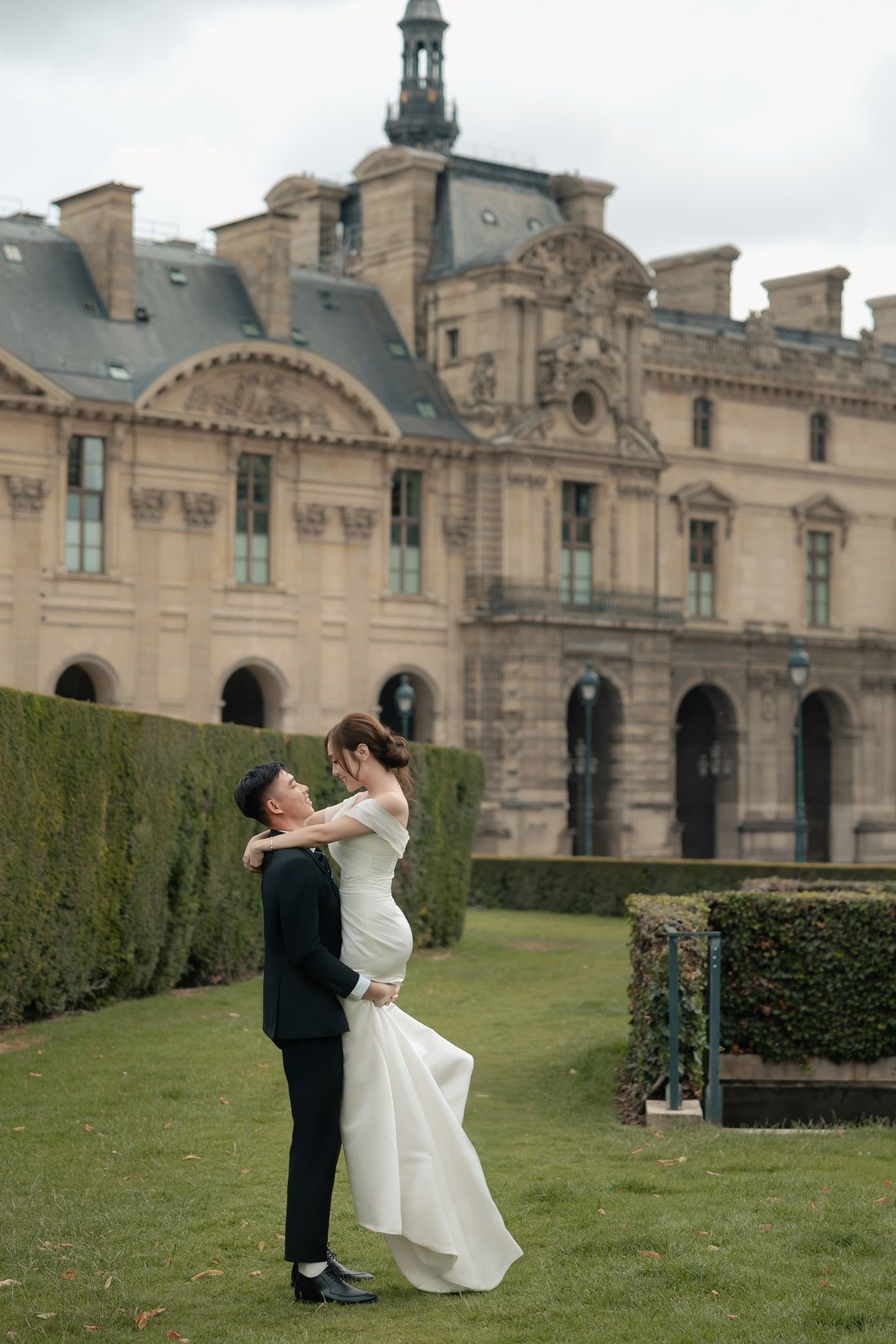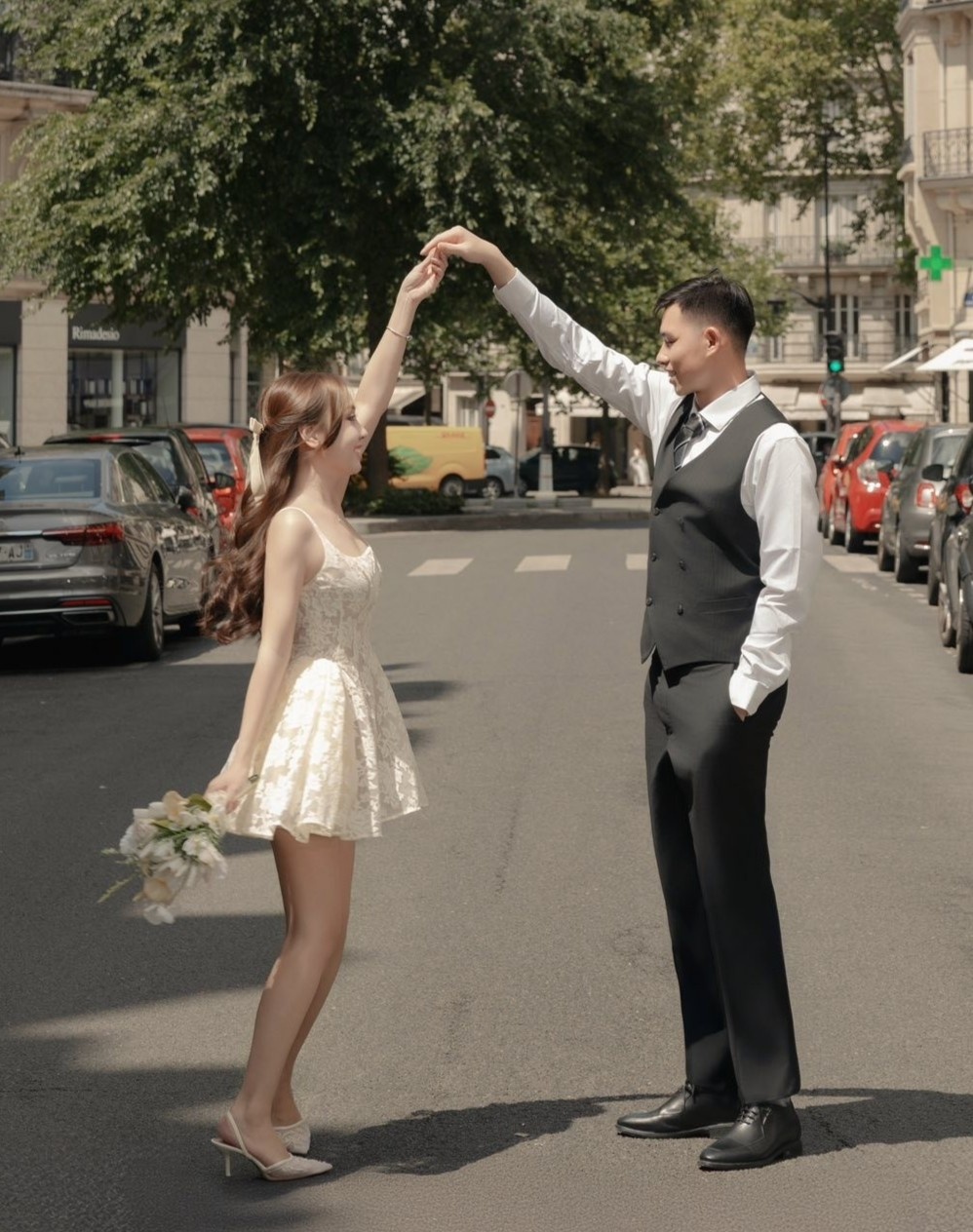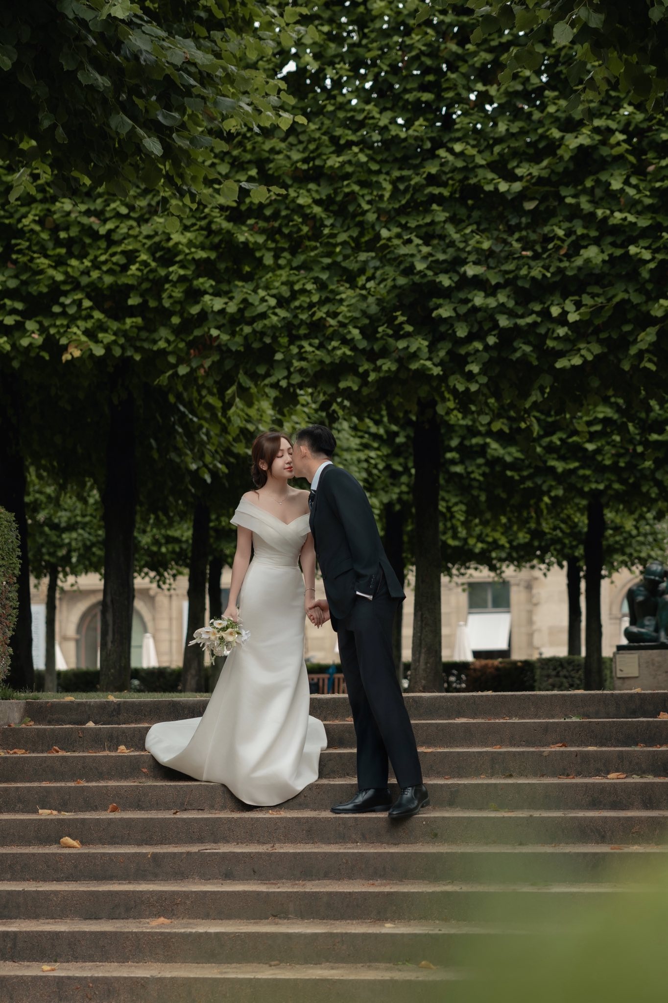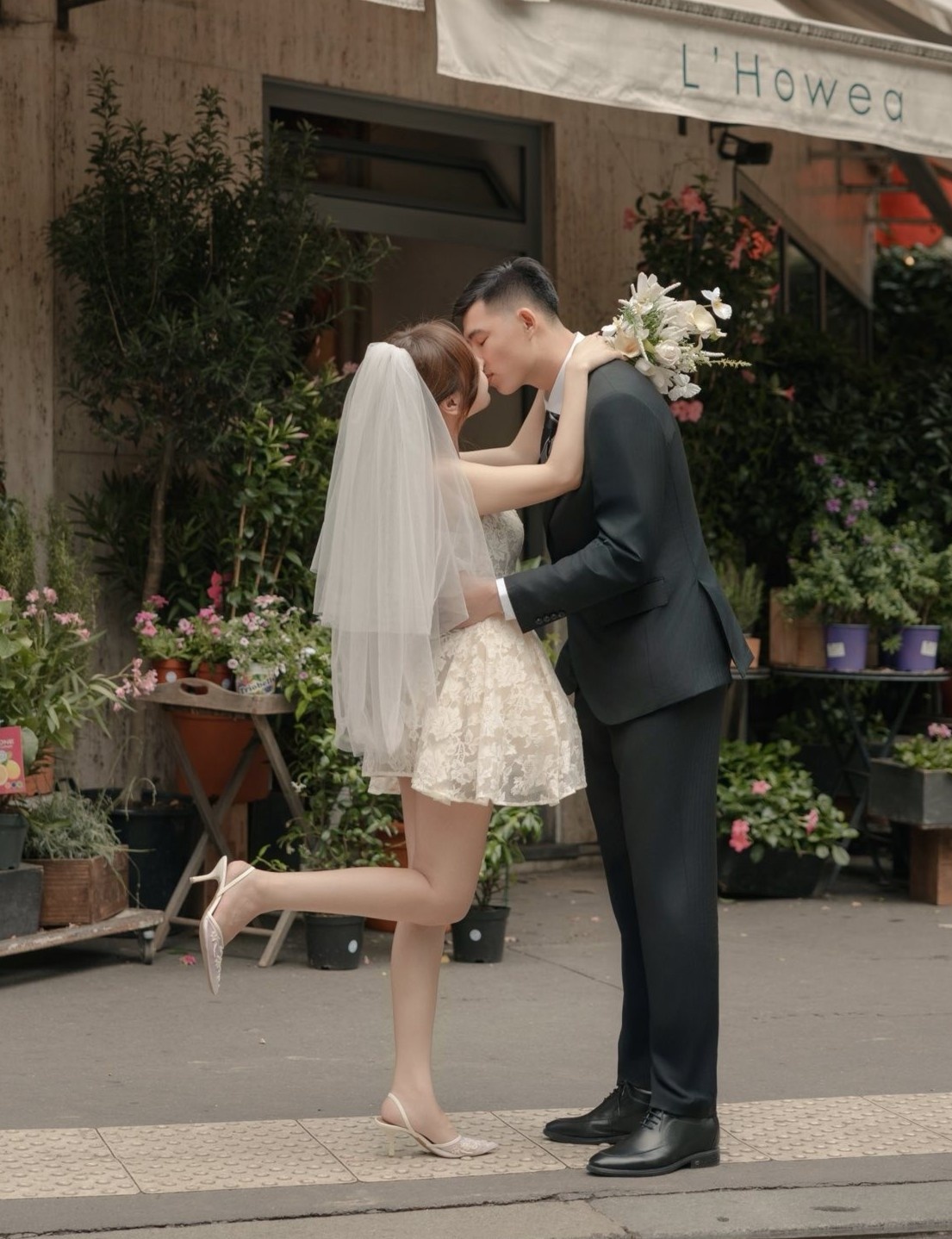 Văn Chuẩn - Dương Hà trao nụ hôn trước một cửa hàng hoa nằm gần đại lộ Rapp, Paris. Đây là địa điểm chụp ảnh với tháp Eiffel lãng mạn, đậm chất Pháp bậc nhất. Ảnh: Quan Văn Chuẩn/Facebook.
