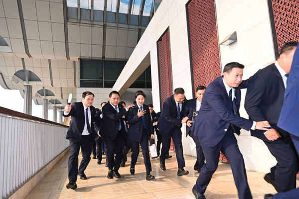 Cán bộ, chiến sĩ Cảnh vệ diễn tập phương án di chuyển đại biểu ra khỏi Hội trường khi có tình huống khẩn cấp.