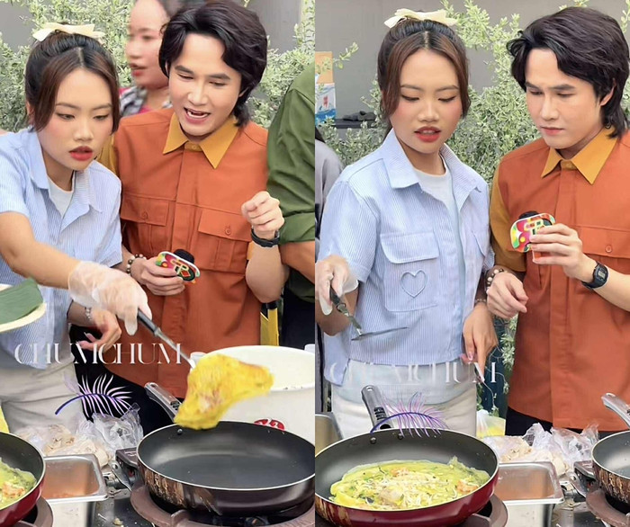Nữ ca sĩ còn trải nghiệm tự tay đổ bánh xèo. (Ảnh chụp màn hình từ TikTok Chumchum)