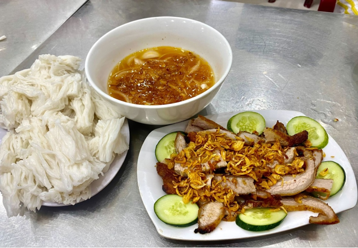 Một phần phở chấm xíu gồm bánh phở tươi, thịt xíu thái lát, rau sống và bát nước chấm nóng hổi. Chỉ cần gắp phở, kèm miếng thịt, chấm ngập nước, du khách sẽ cảm nhận hương vị hòa quyện tinh tế – vừa dân dã, vừa mới lạ. Ảnh checkinvietnam