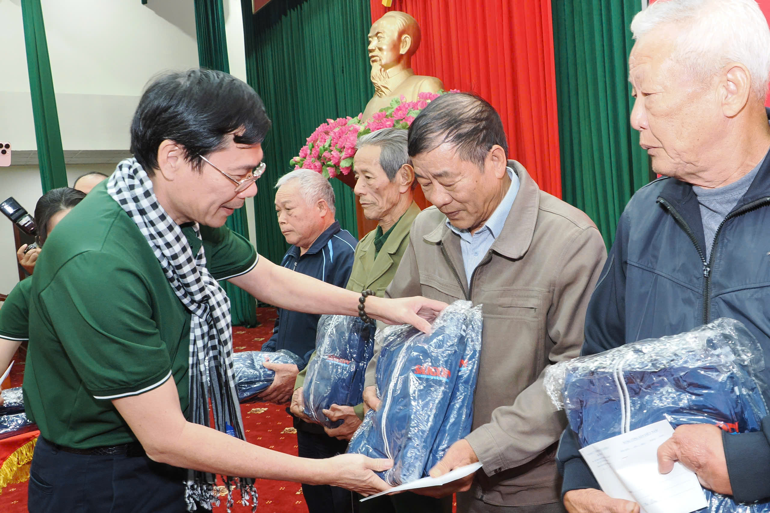 Đồng chí Phạm Quý Trọng tặng quà các gia đình khó khăn. Ảnh: HOÀNG HÙNG