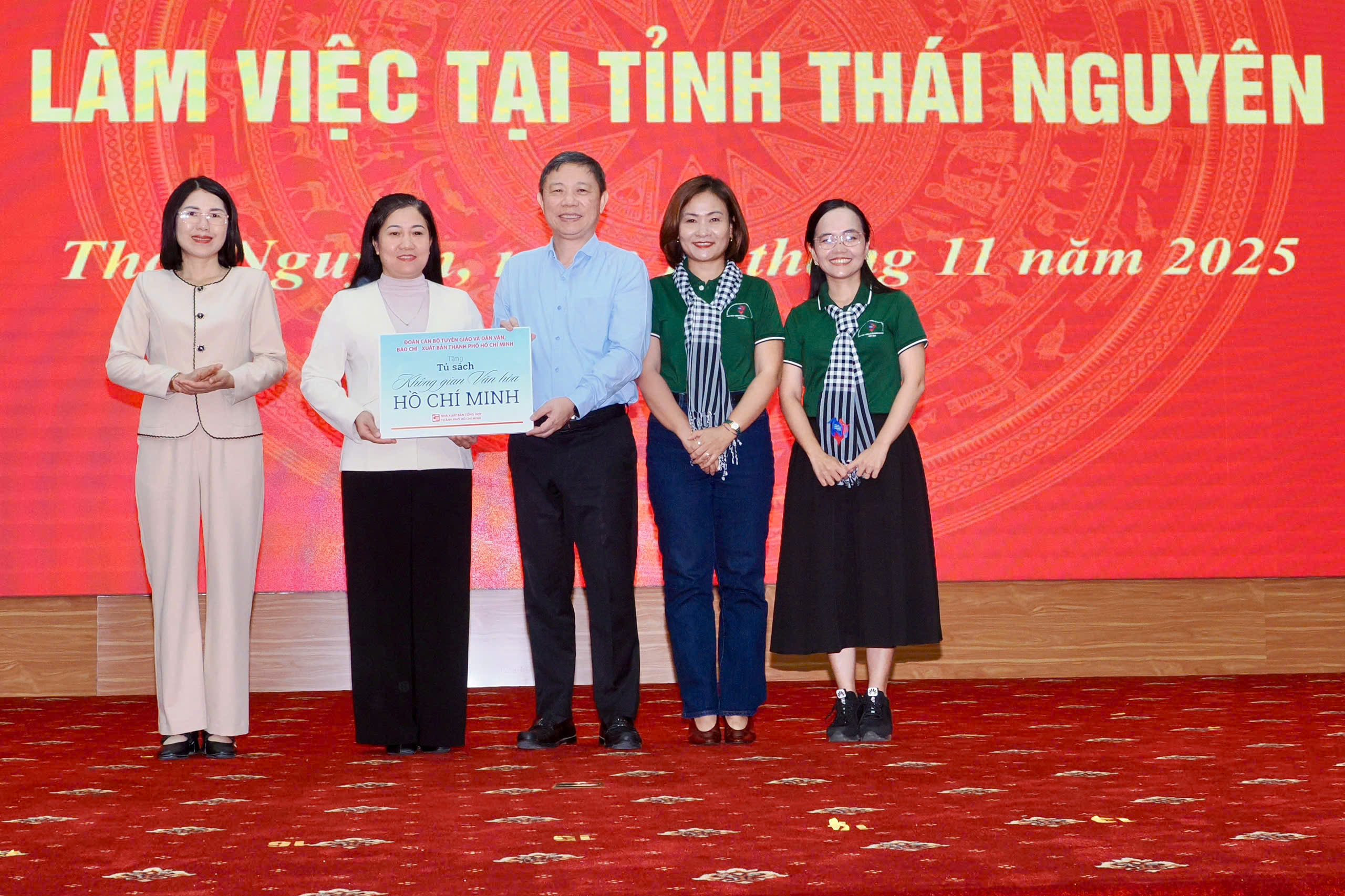 Đoàn công tác trao tặng tủ sách Không gian văn hóa Hồ Chí Minh đến tỉnh Thái Nguyên. Ảnh: HOÀNG HÙNG