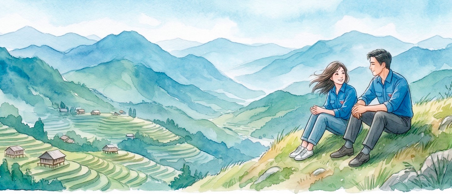 Mùa hè năm đó, họ cùng nhau lên tình nguyện tại Lạng Sơn. Chuyến xe sớm lăn bánh qua những cung đường đèo quanh co. Khi trời sáng hẳn, Lệ mở mắt và… sững lại. Trước mắt cô là núi. Không phải những quả đồi thoai thoải lác đác mà cô đã từng thấy qua cửa kính ô tô. Khung cảnh là núi… nối tiếp núi… trùng điệp, xanh thẳm, hùng vĩ như một bức tranh khổng lồ.