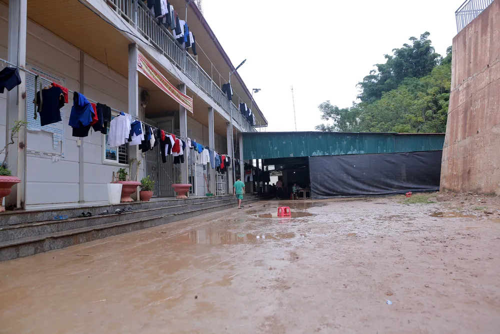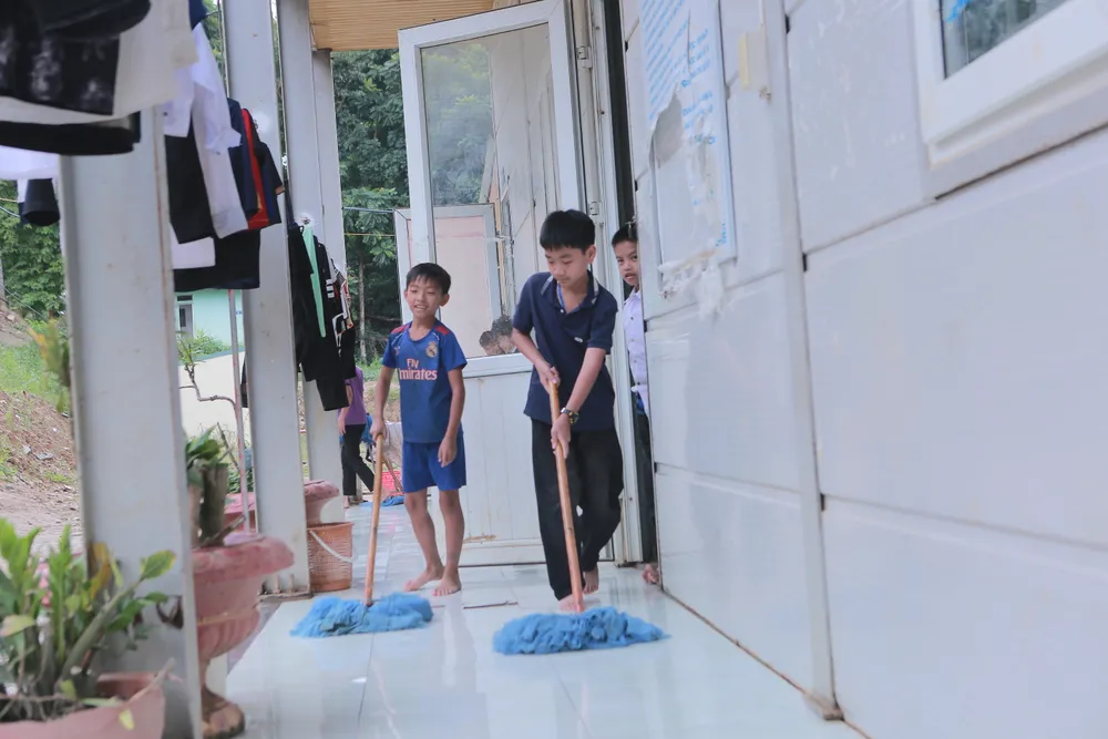 Dẫn chúng tôi vào phía bên trong nơi nhà ở dành cho các em học bán trú, là hình ảnh quần áo phơi đầy trên những cửa sổ.