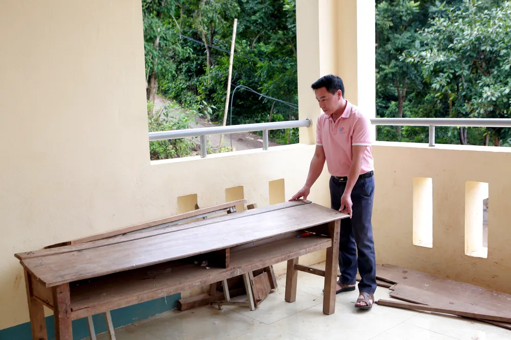 Bên hông góc cầu thang của ngôi trường khang trang, thầy Pó Ly vừa chỉ tay về phía chiếc bàn cũ chia sẻ: “Chiếc bàn này mấy ngày trước gãy chân, mặt bàn bị tách dọc vừa được thầy sửa lại hôm chủ nhật tuần trước để kịp dạy đưa vào cho các em học sinh sử dụng”.