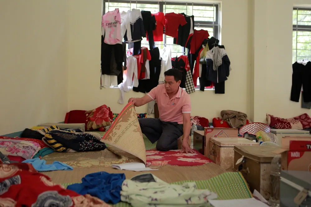 “Như vậy từ 50 giường ban đầu đã đáp ứng đủ cho 150 học sinh thay vì 100 học sinh như bình thường, hiện vẫn còn lại 162 em phải trải đệm mỏng trên nền gạch để ngủ nghỉ, sinh hoạt”, thầy Liêm bùi ngùi.