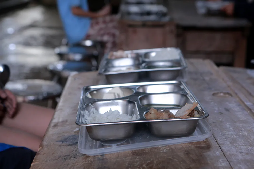 Những khay cơm đặt lên bàn ăn tận dụng từ những chiếc bàn học nghiêng nghiêng vì thế các em học sinh phải kê thêm những miếng nhựa để giữ thăng bằng cho nước canh không tràn ra bên ngoài.