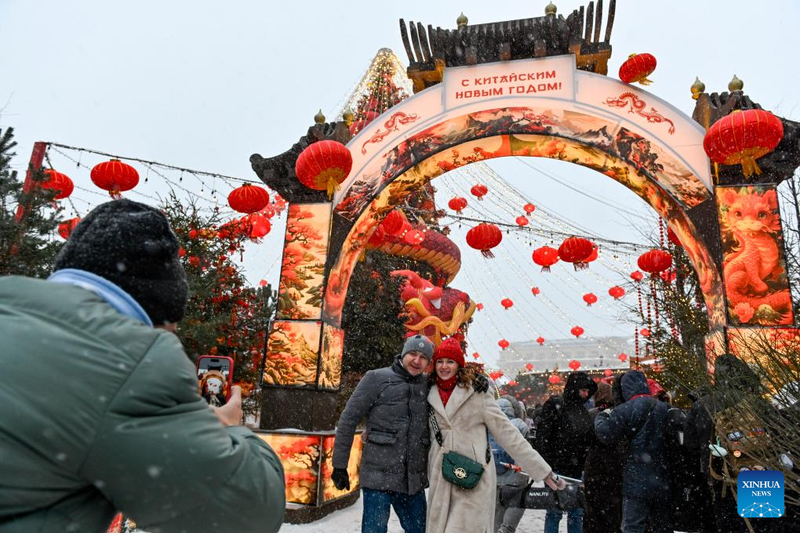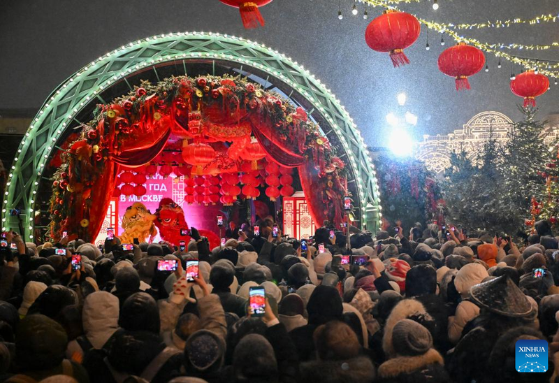 Du khách thưởng thức màn múa lân trong lễ khai mạc các hoạt động mừng Tết Nguyên đán tại Moscow, Nga.